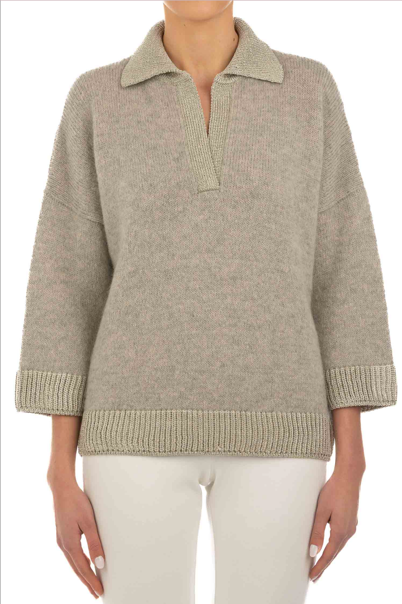 3/4 sleeve, collared, V-neck sweater. Ribbed muted gold arms cuffs and waist band. Alpaca mohair blend.