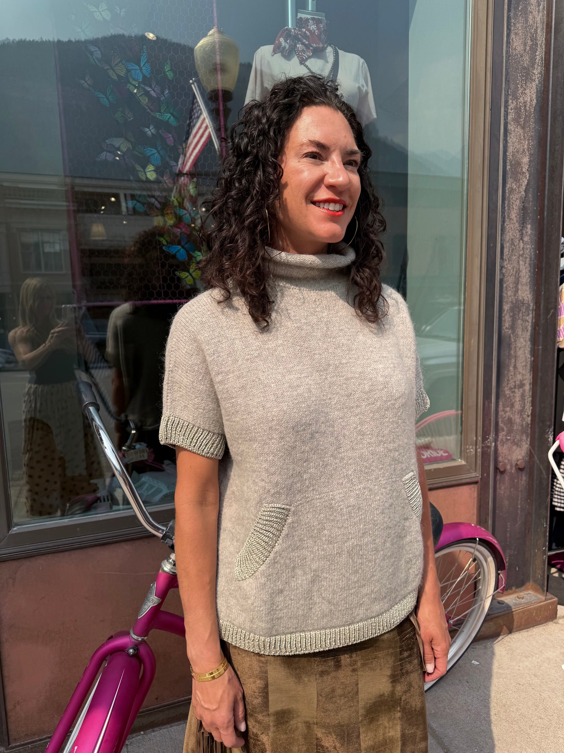 Mock neck, short sleeve, kangaroo pouch sweater, ribbed light gold sleeve and waist band. Alpaca mohair blend.