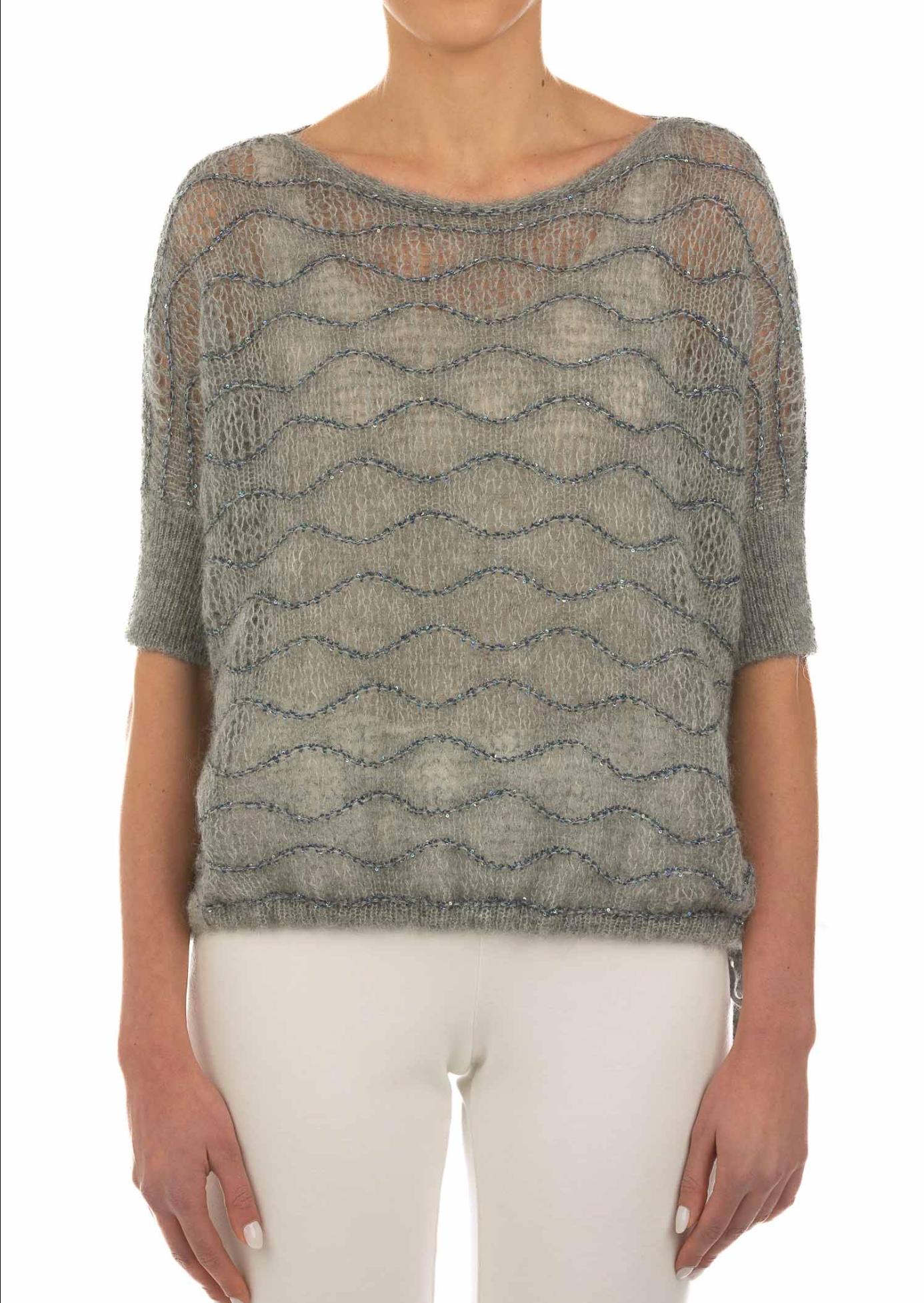 Elbow length ribbed sleeve, boat neck. Blue iridescent sparkle waves throughout body. Cinch tie at waistband.