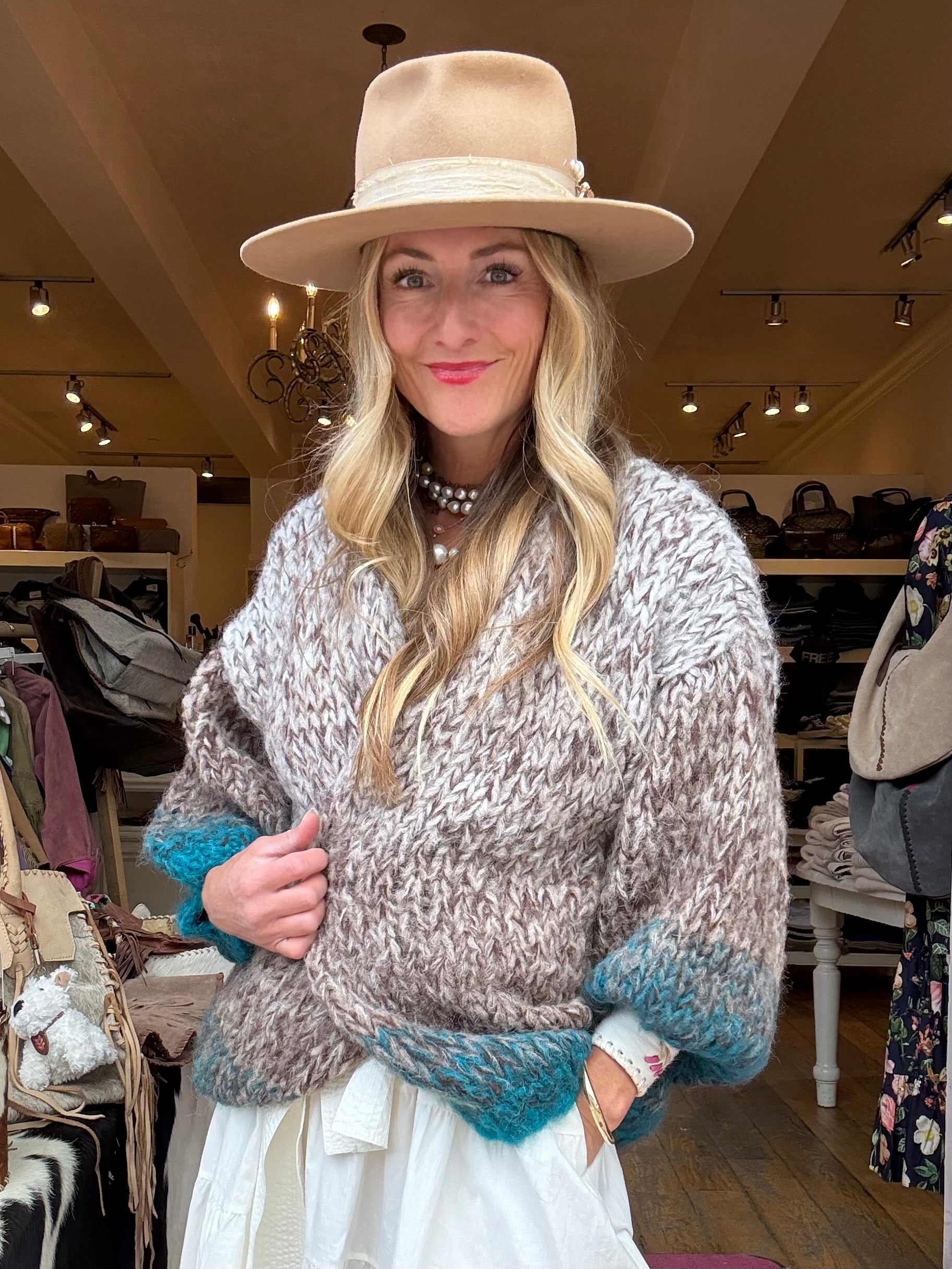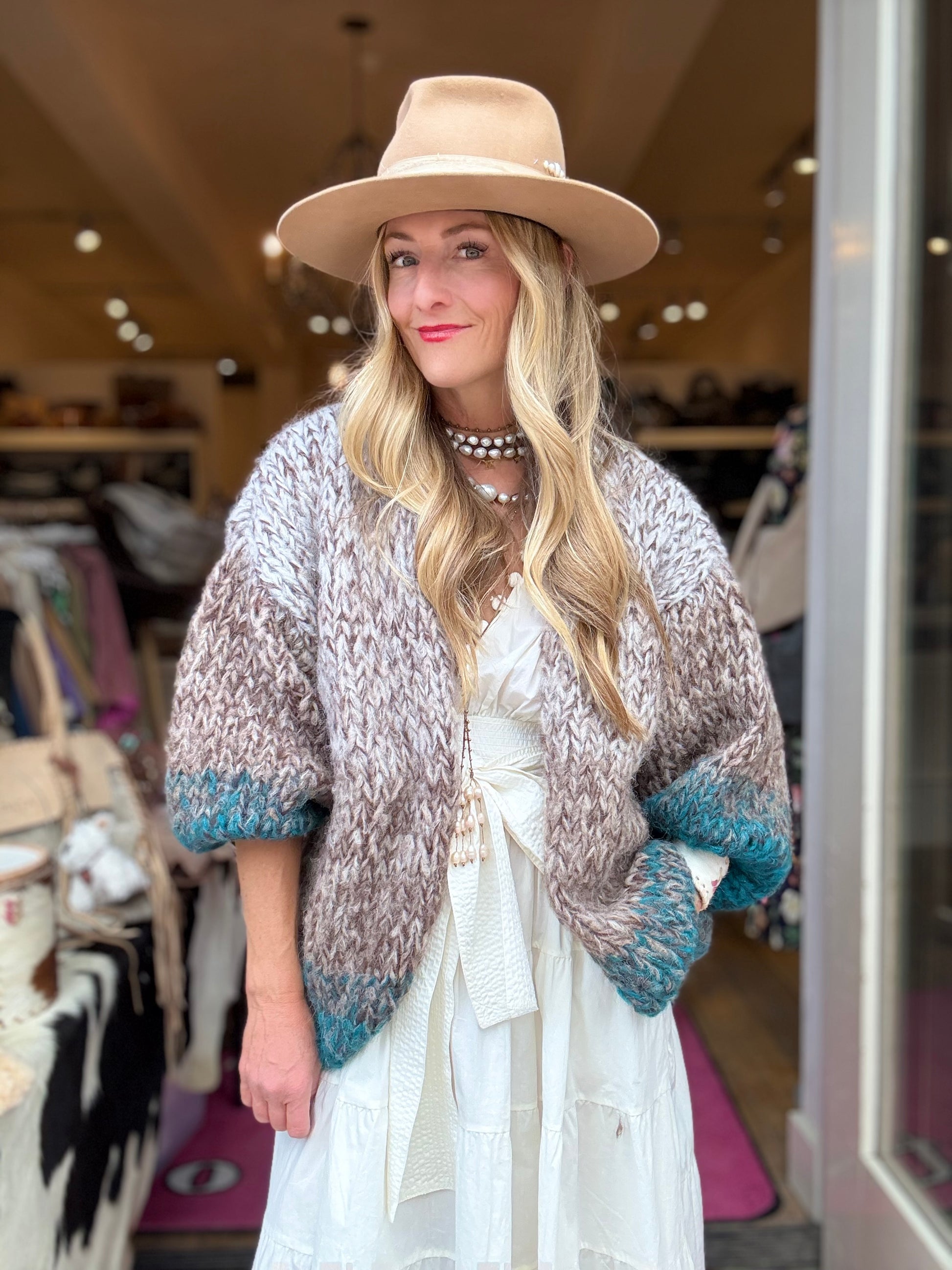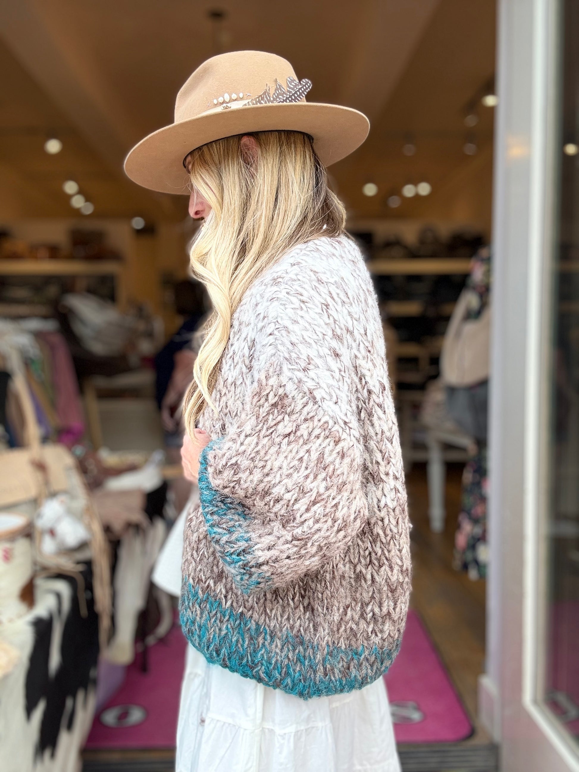 Hand knit oversized Alpaca cardigan in brown and white melange with teal trim.