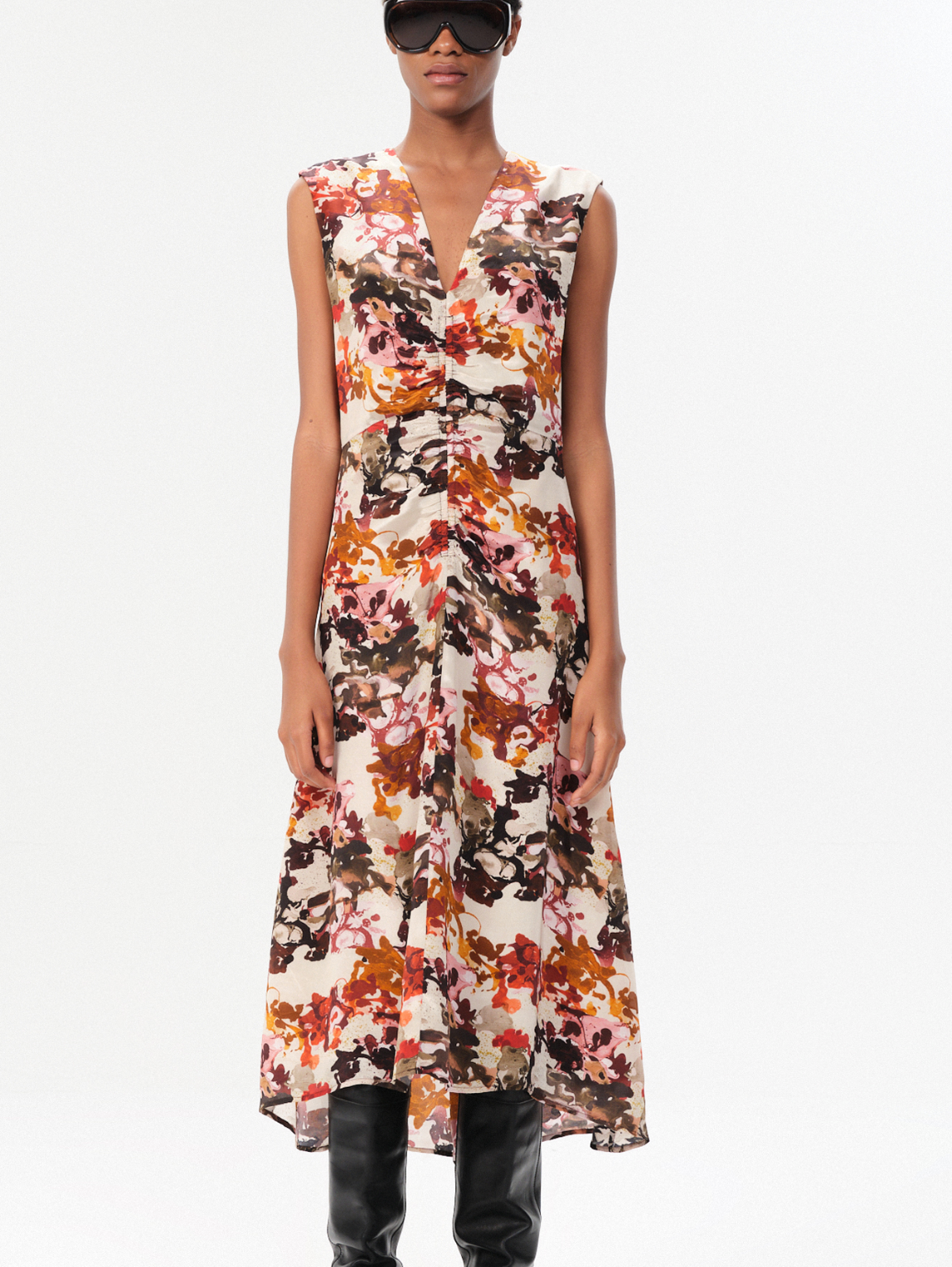 Silk dress has ruching through the body.