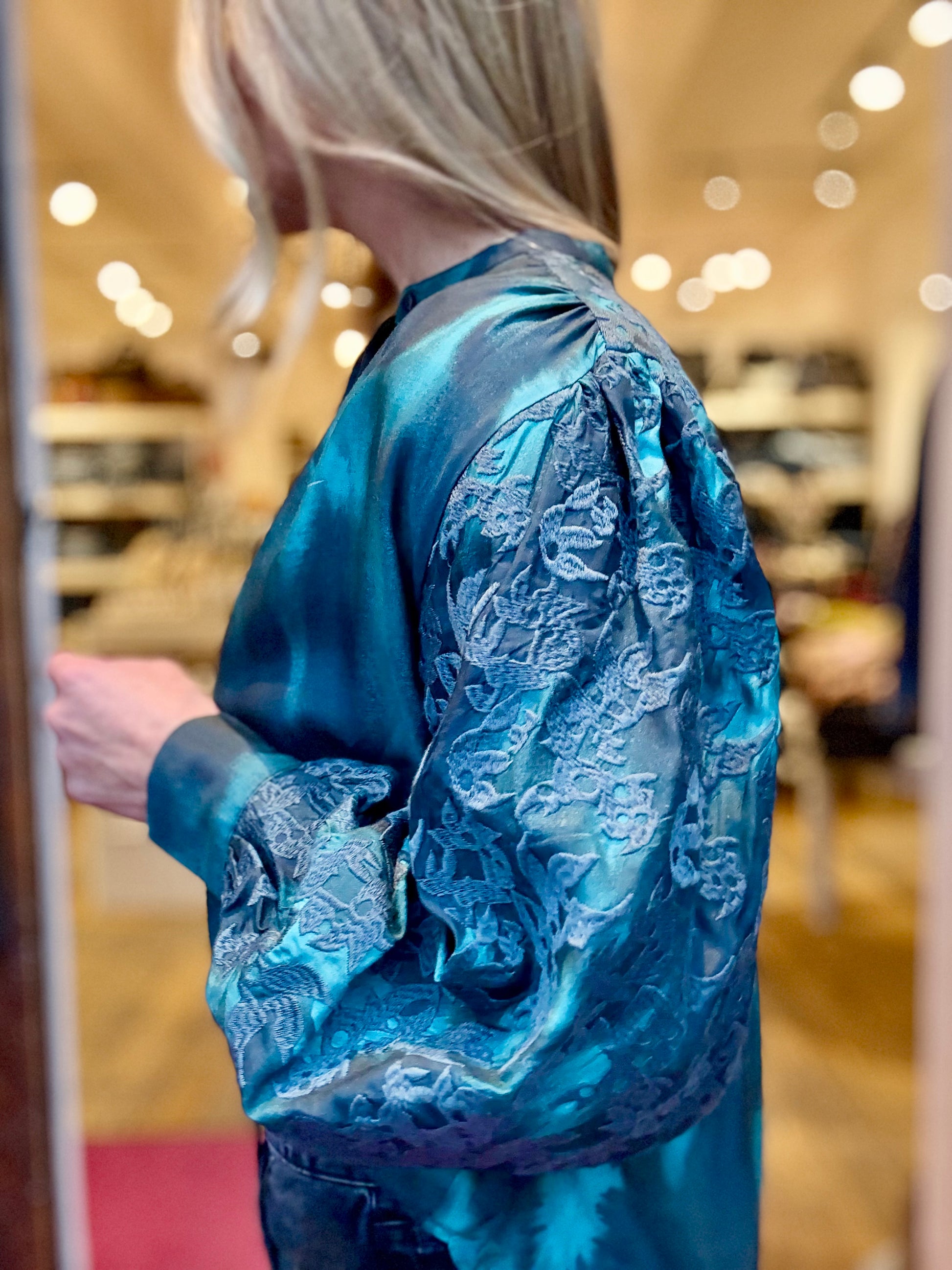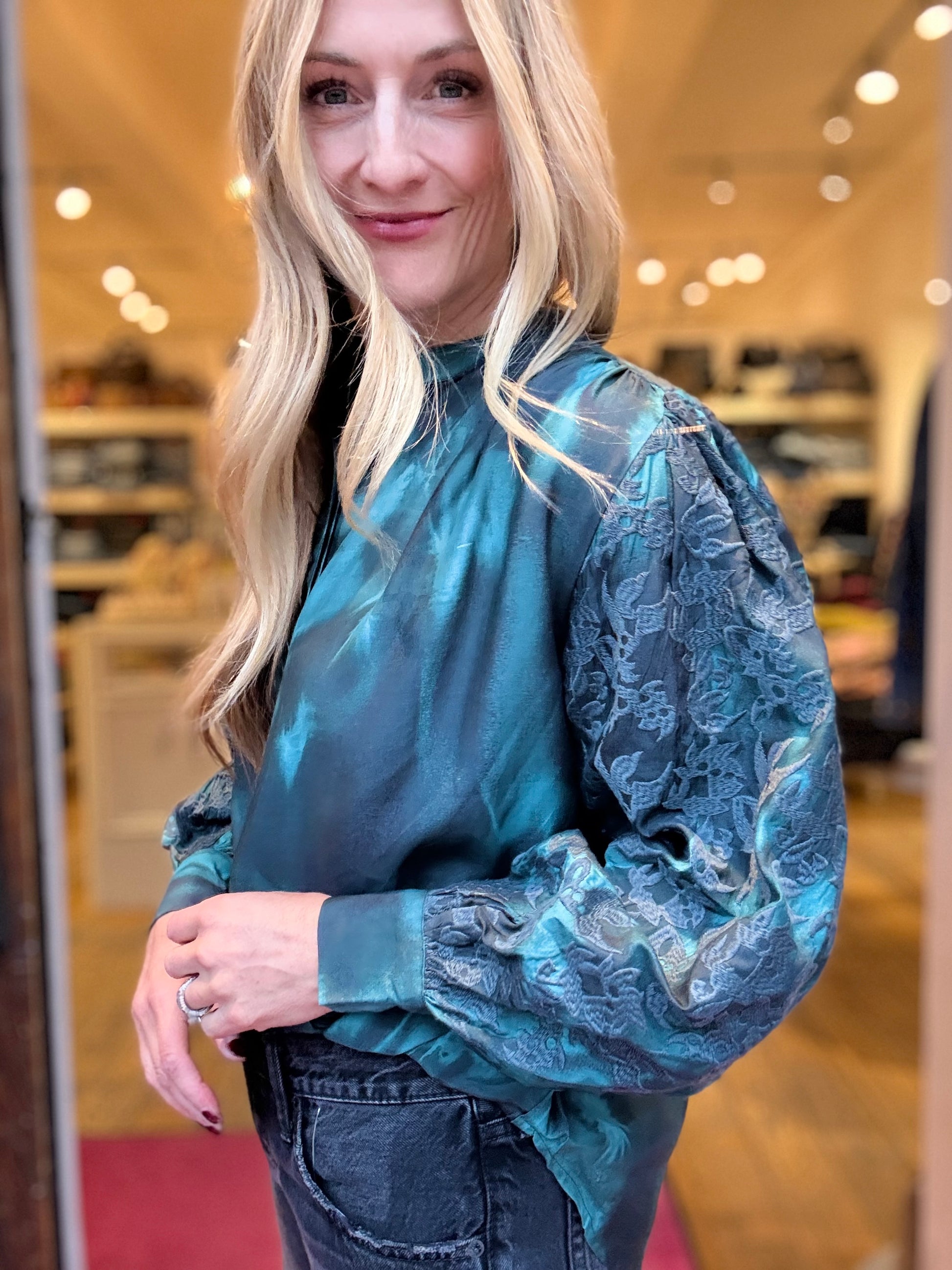 Boxy tie dye blouse with lace detail on sleeves and tie at neck.
