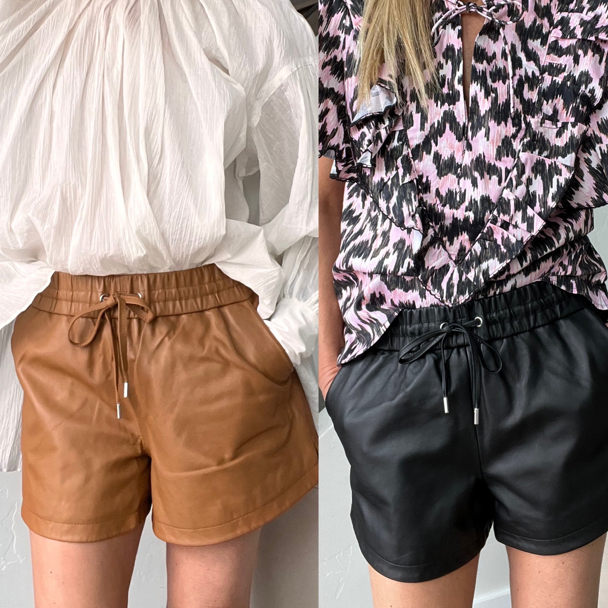 FINAL SALE! 100% leather short. Elastic and drawstring waist. Model in size 4.