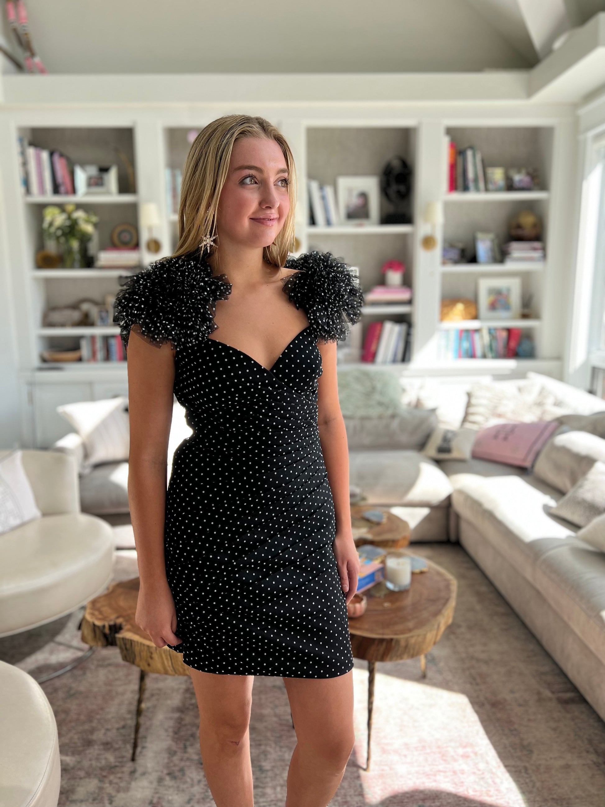 - "Peyton" ruched tulle mini dress with polka dots and shoulder ruffles