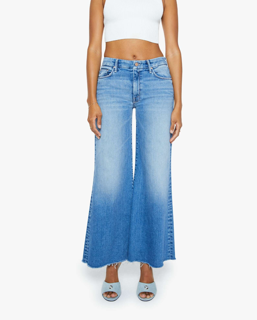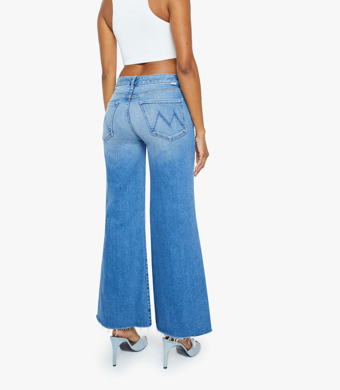This iconic high-waisted wide leg has a 31-inch inseam and a frayed hem. Cut from stretch denim, Fan Favorite is a mid-blue with whiskering and fading at the knee.