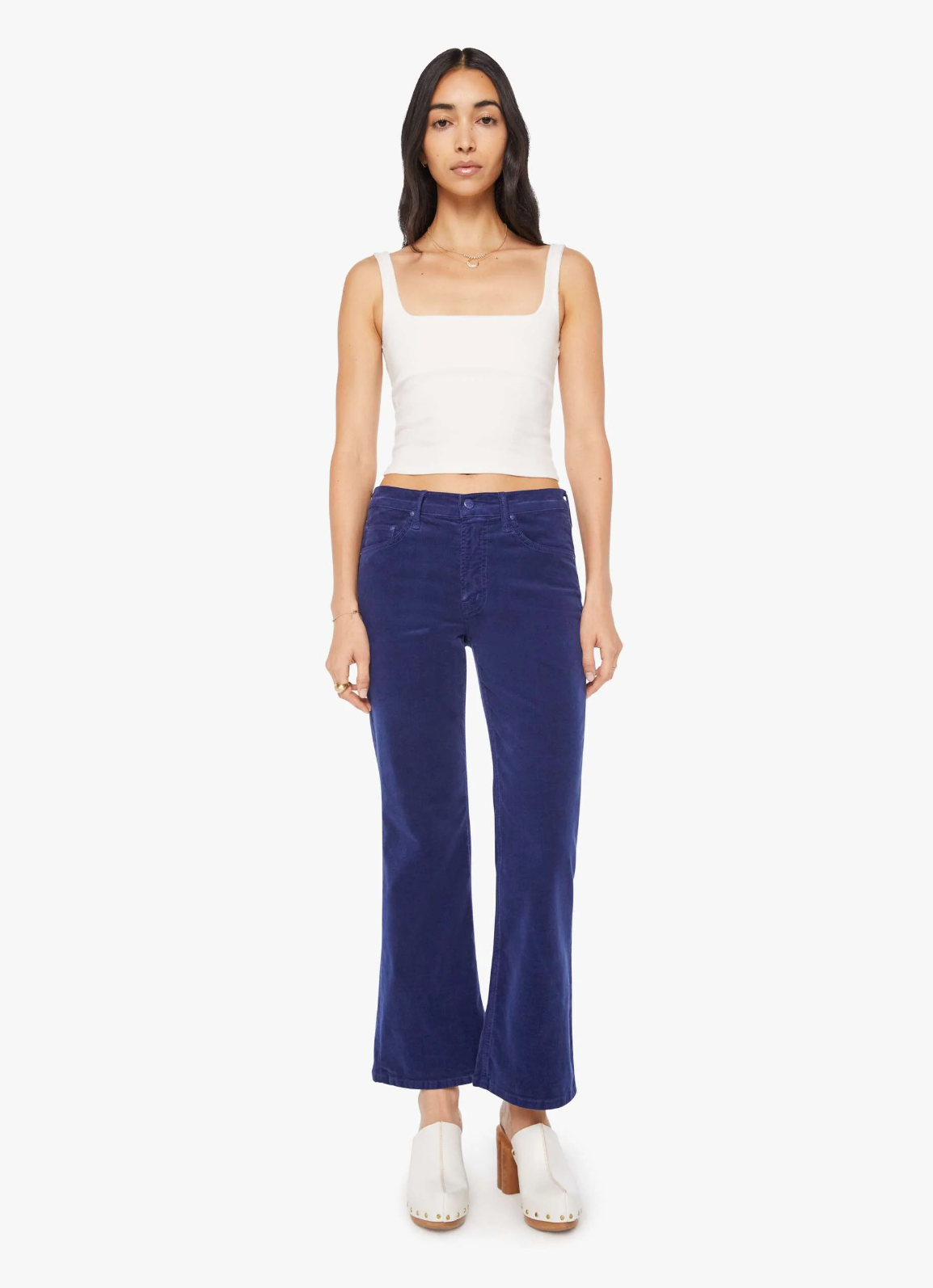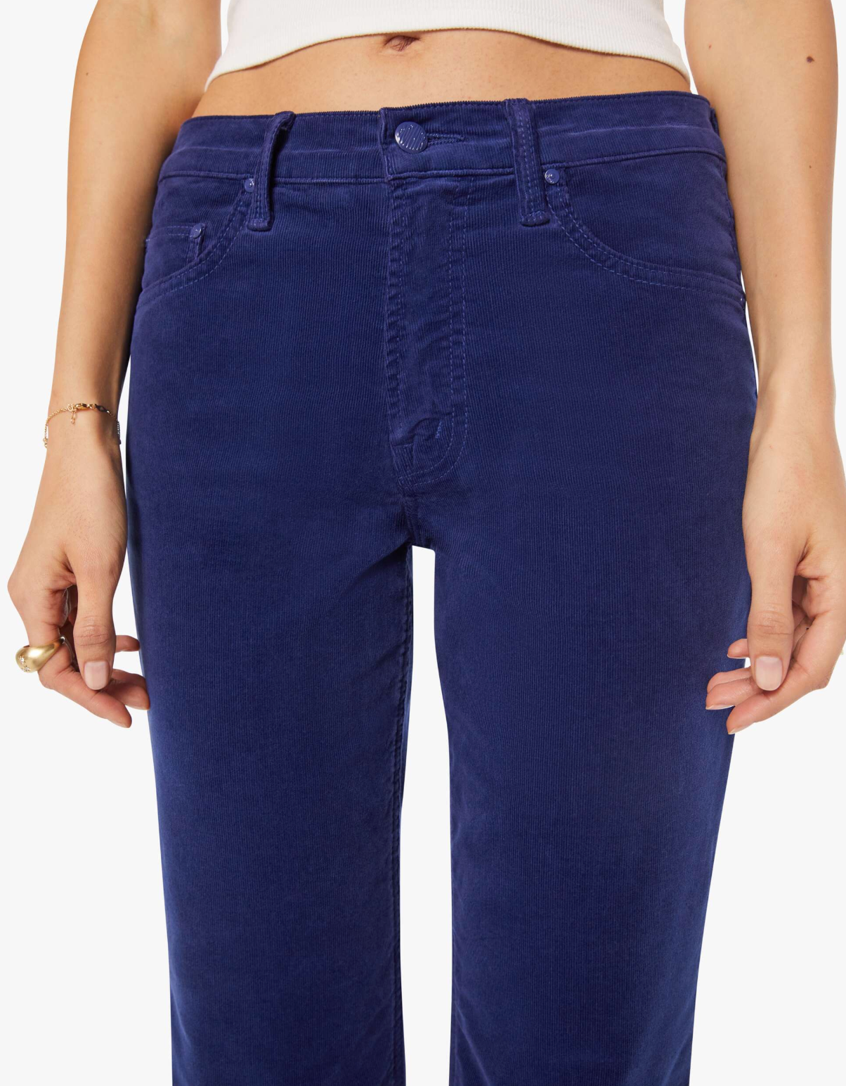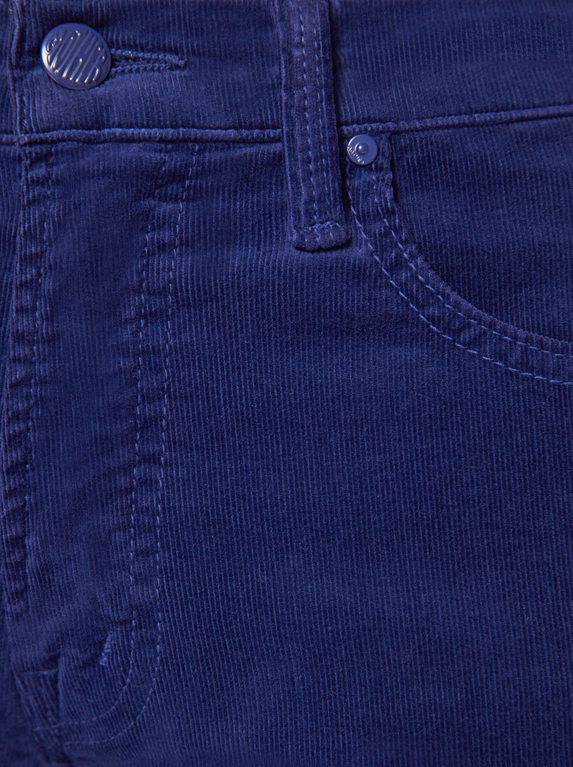 A high-rise bootcut with a looser leg and a 28.25-inch inseam with a clean hem. Made from a stretch cotton blend, Twilight Blue is a navy micro-corduroy with tonal hardware.