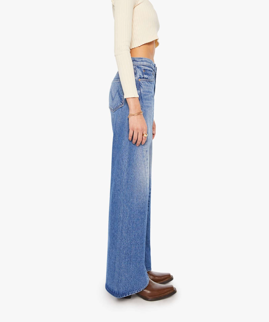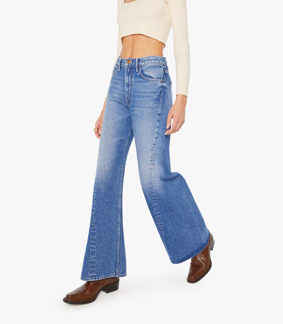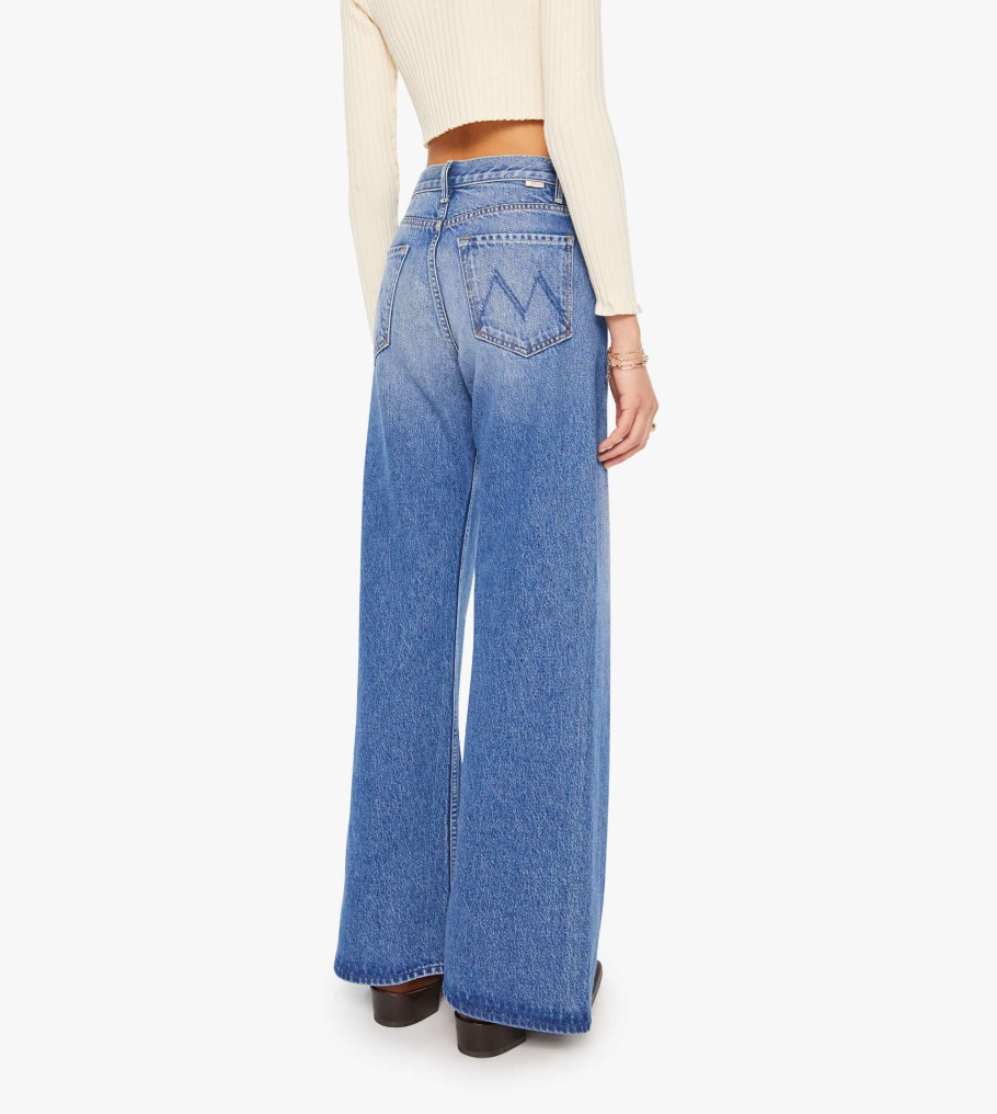 A high rise jean with a flare and a clean hem. Made from a rigid recycled cotton blend, Rolling In The Dough is a mid-blue with a pretzel-detailed button and candy-inspired interior rivets.