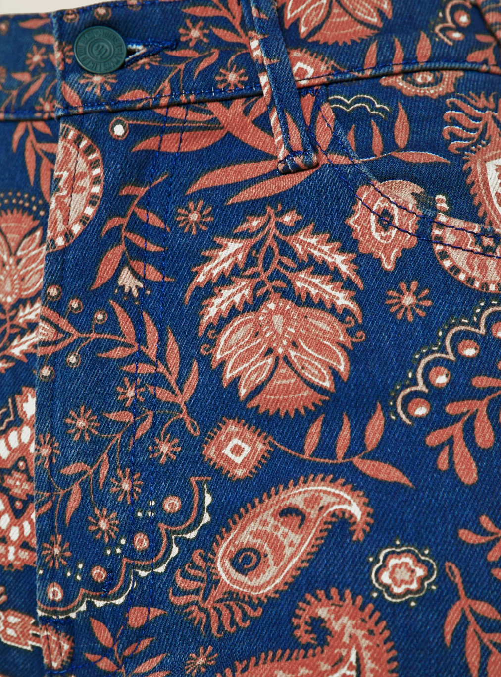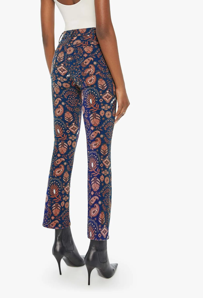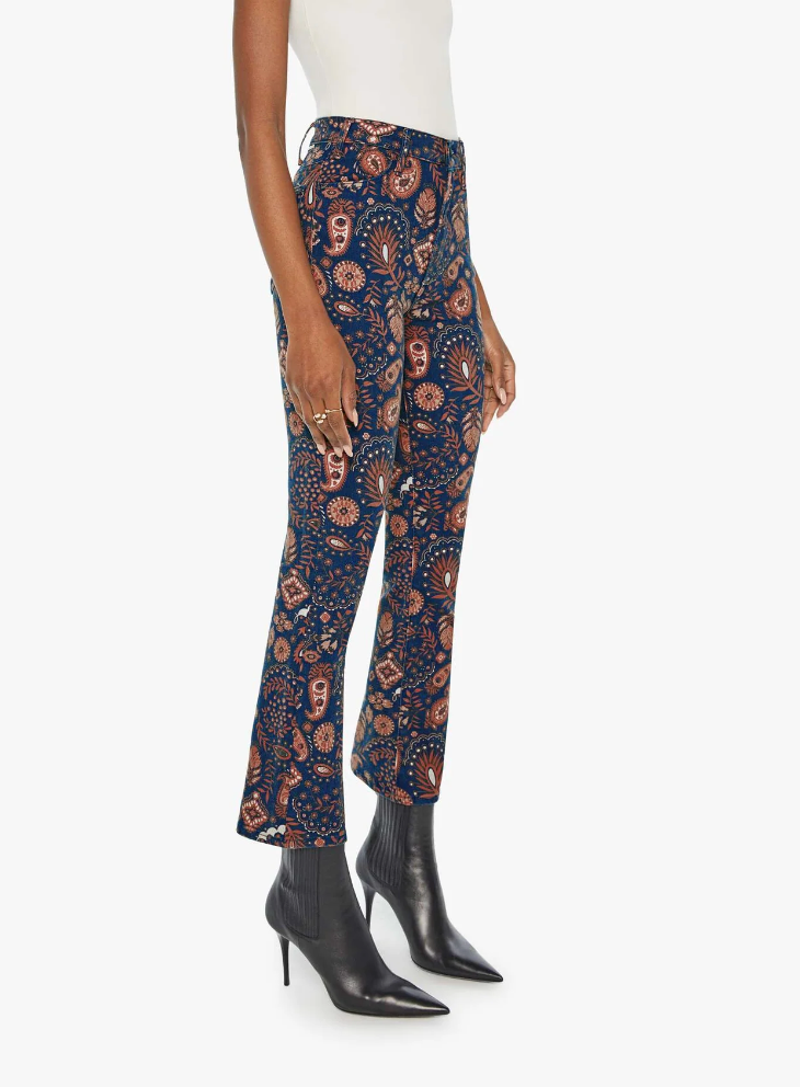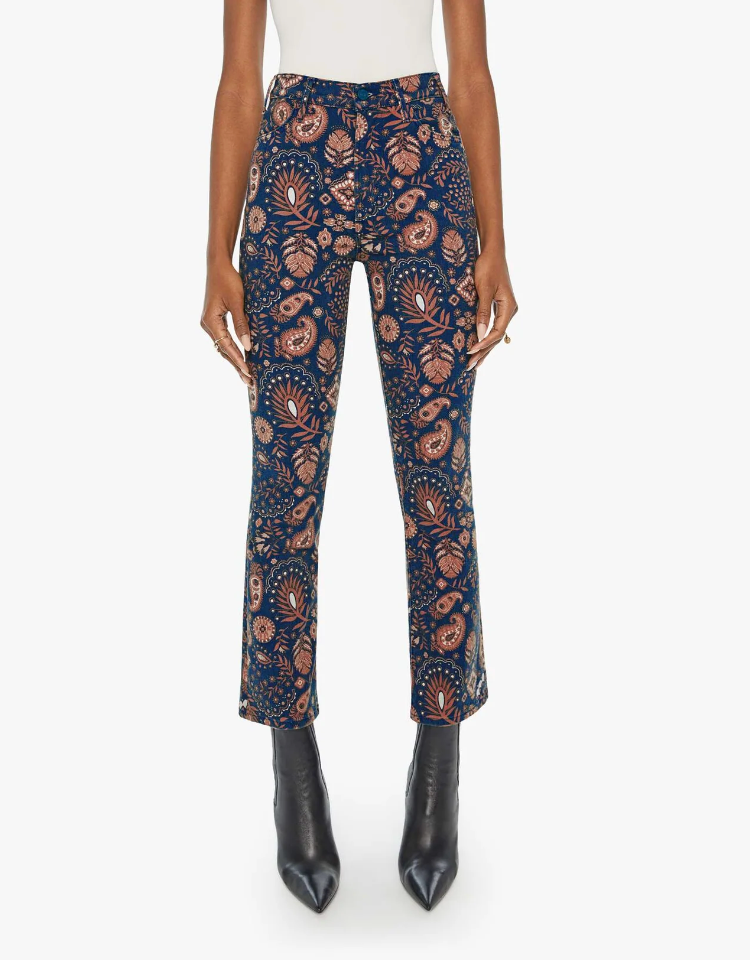 High-waisted bootcut with a 28.25-inch inseam and a clean hem. Made from a cotton blend with a touch of stretch, Henna Happiness is a navy and pink paisley print.