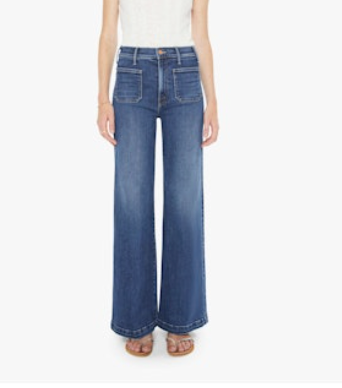 70s-inspired wide leg jeans with a high rise, patch pockets, 33-inch inseam and clean hem. Made from stretch denim.
