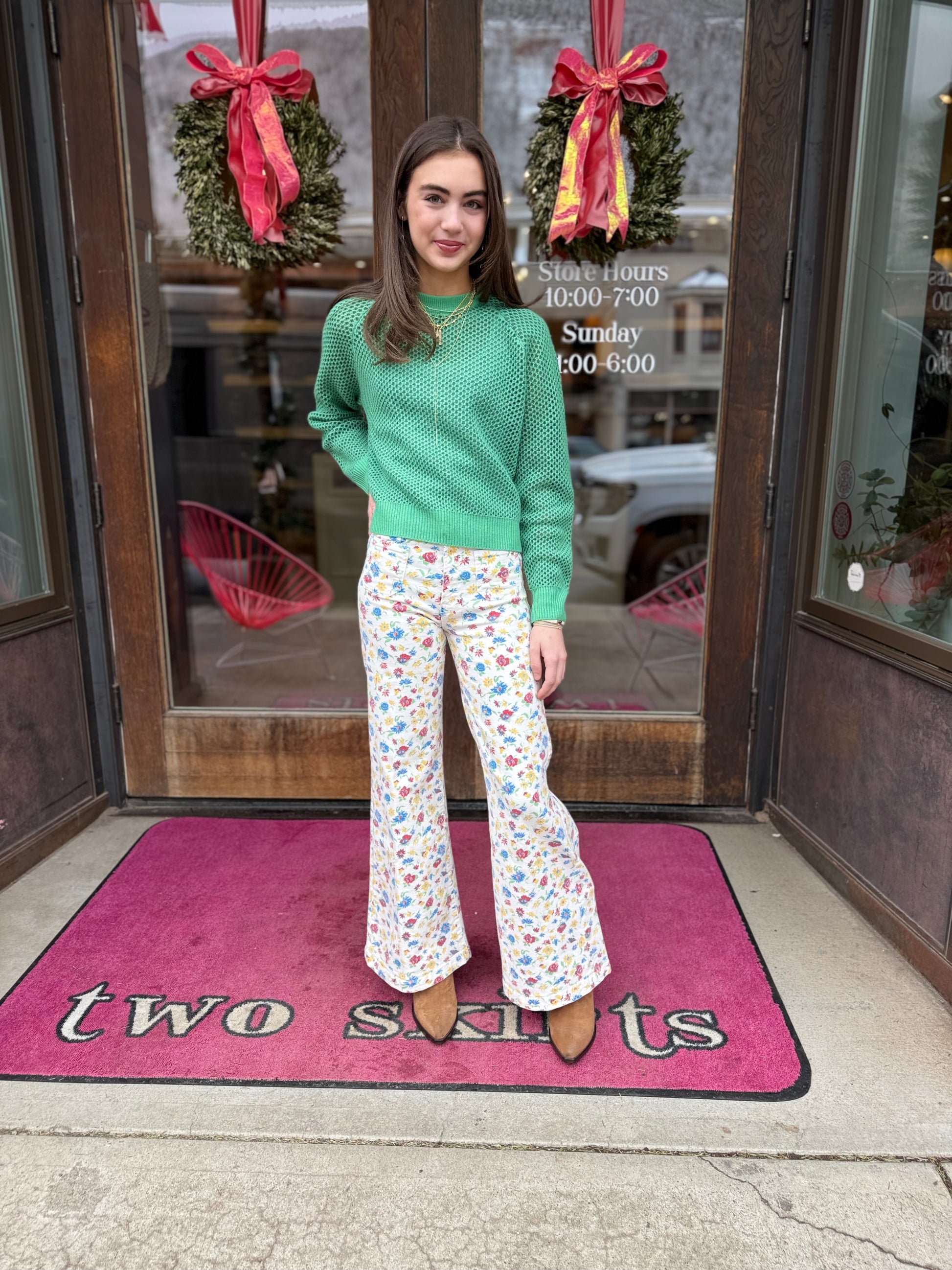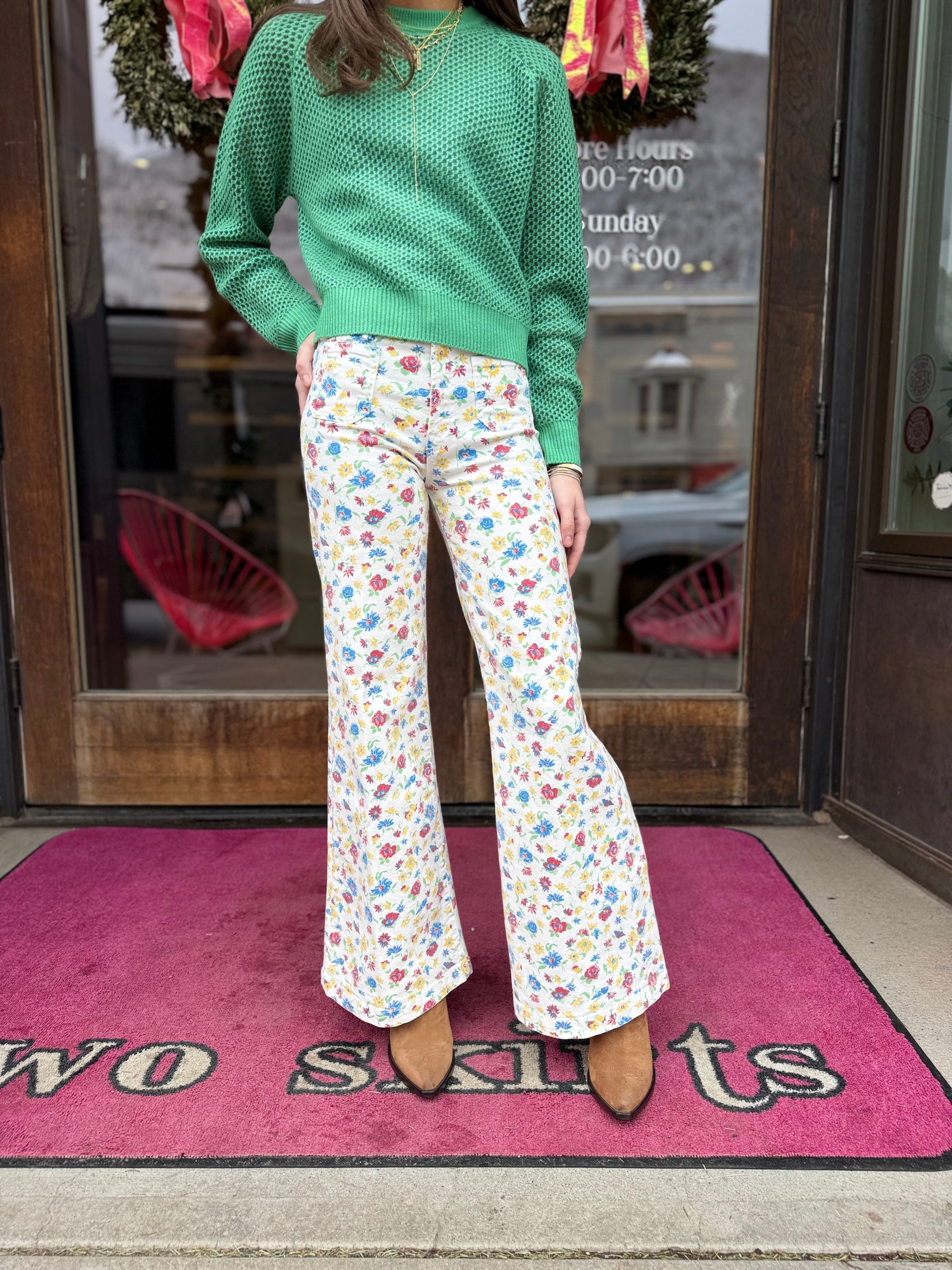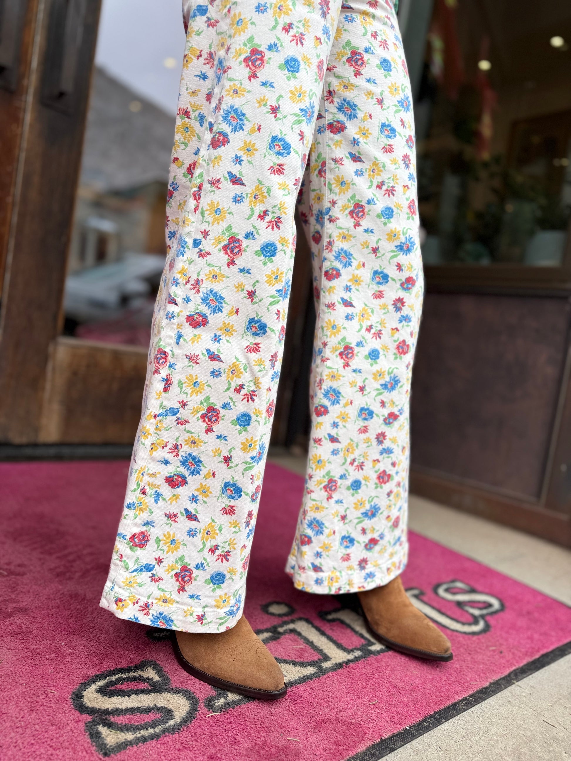 70s-inspired wide leg jeans with a high rise, patch pockets, 33-inch inseam and clean hem. Made from stretch denim, Rose Bowl is a red, blue and yellow floral print on white jean.