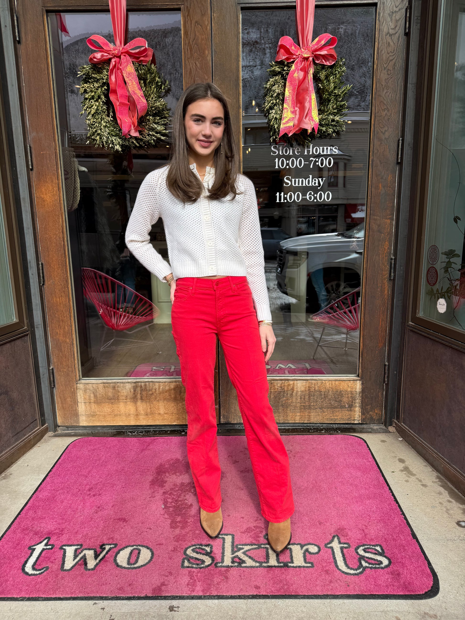 A high-rise straight leg jean with a 32-inch inseam and a clean hem. Cut from stretch denim, Tango Red is a true red with no fading.