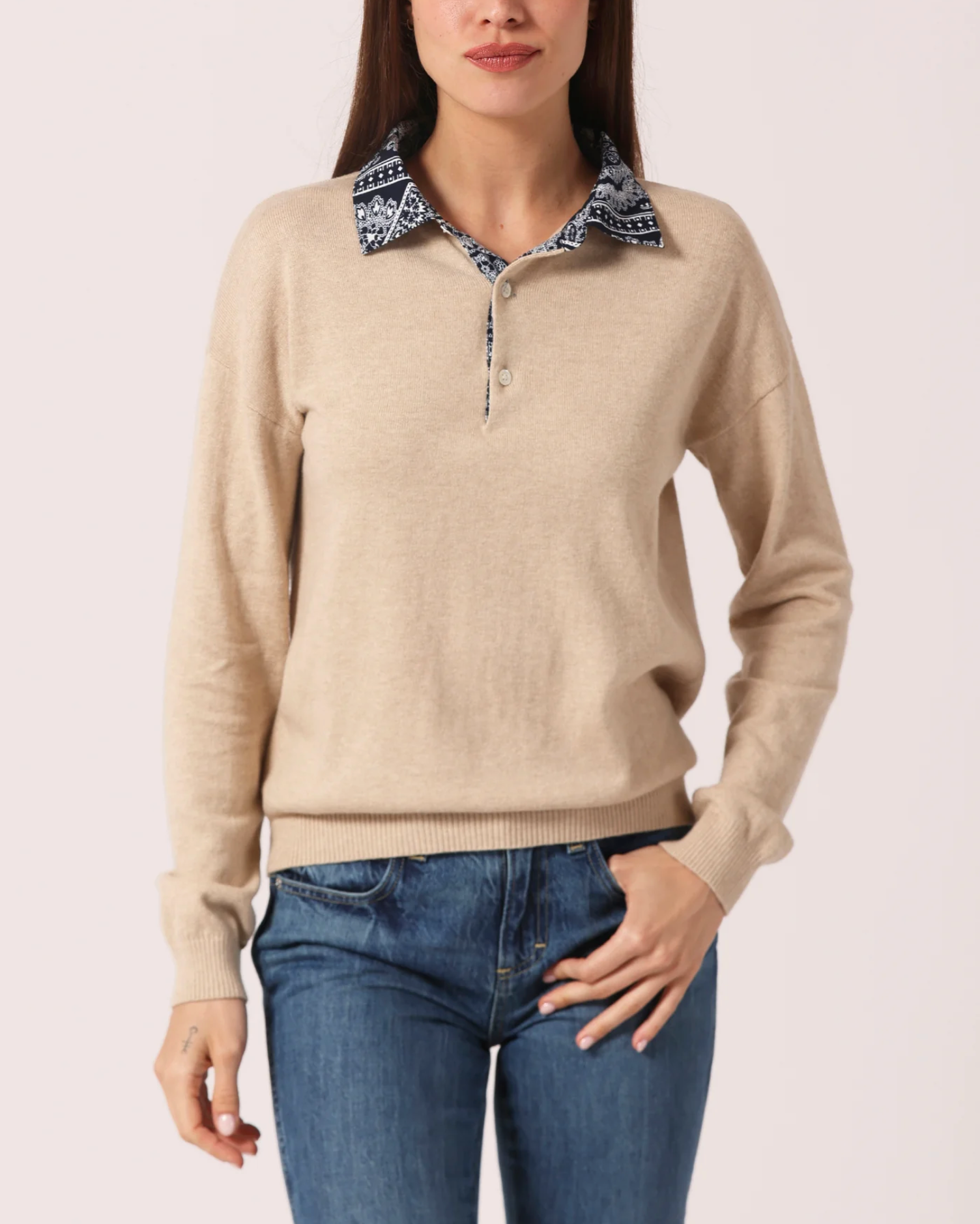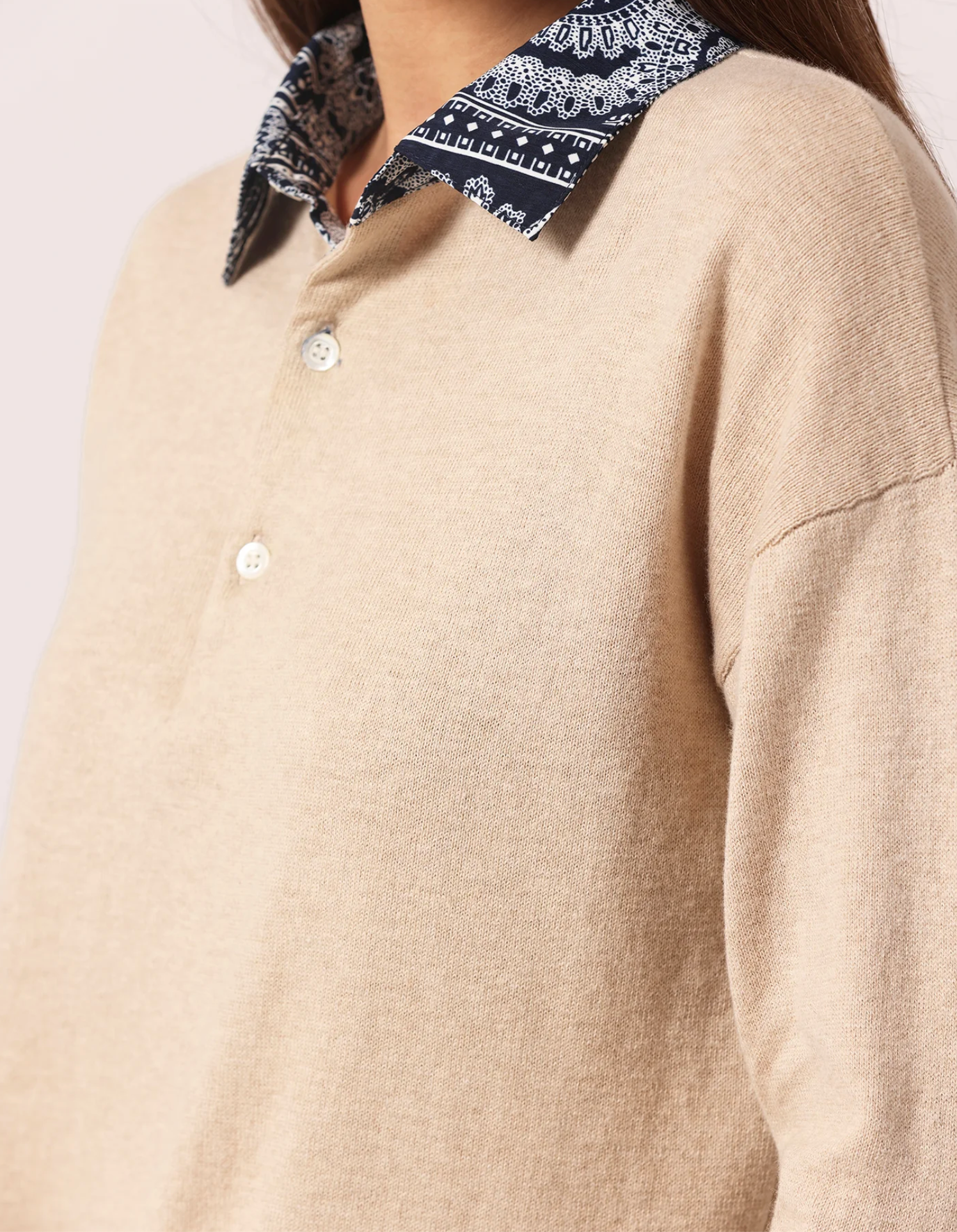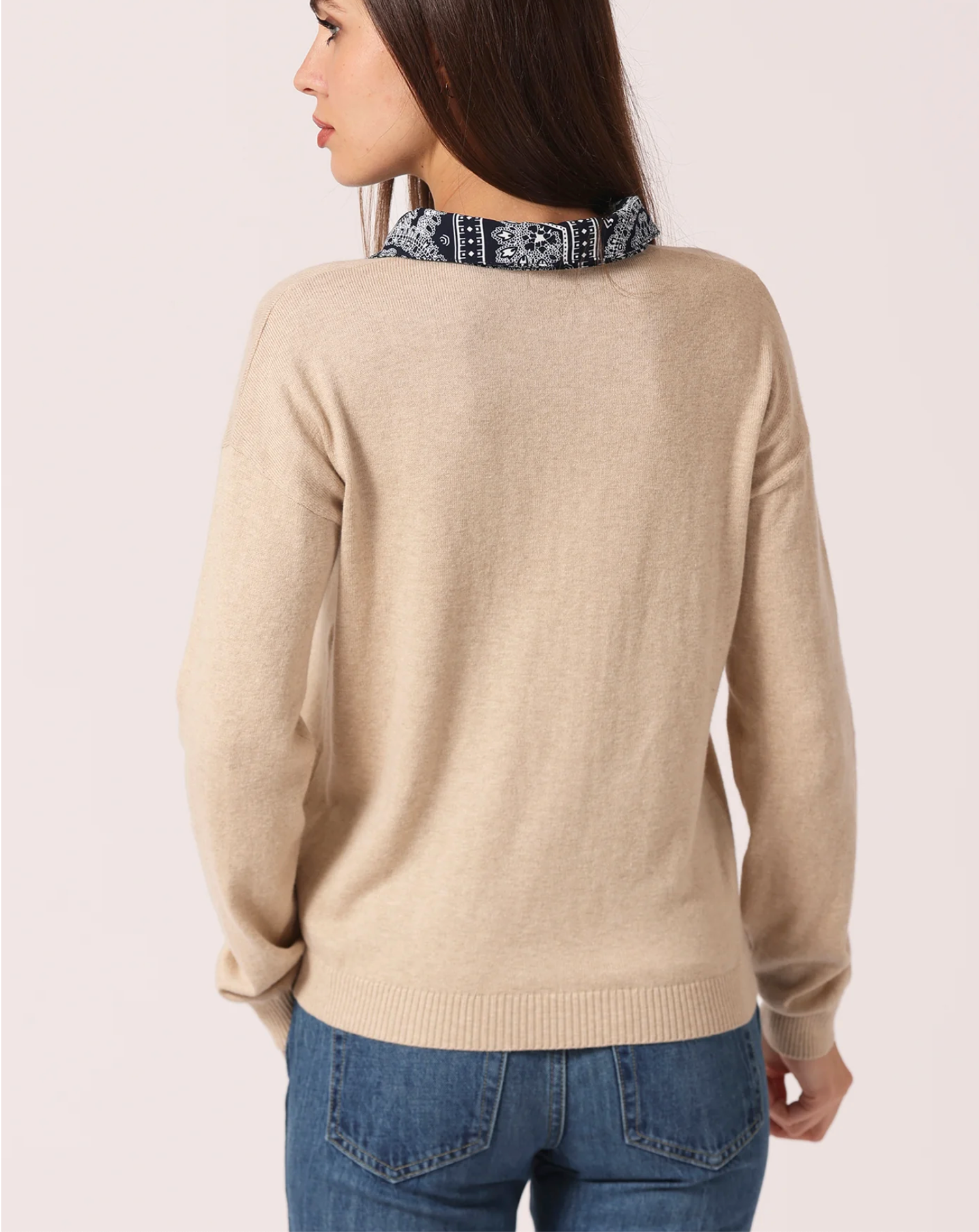 The Cotton Cashmere Woven Bandana Collar Pullover brings serious personality with a playful twist—thanks to its unique bandana-style collar and ultra-soft cotton cashmere yarn.