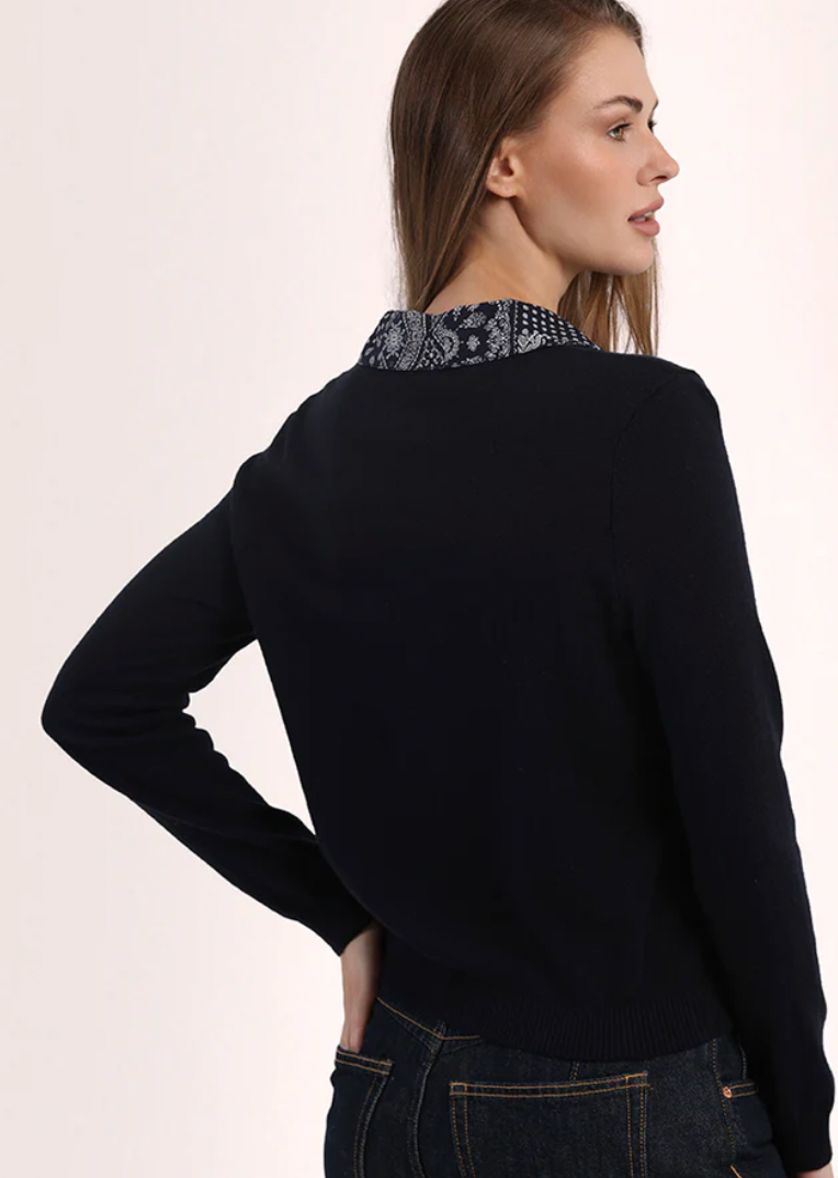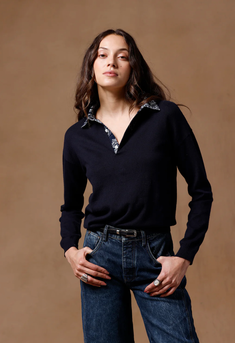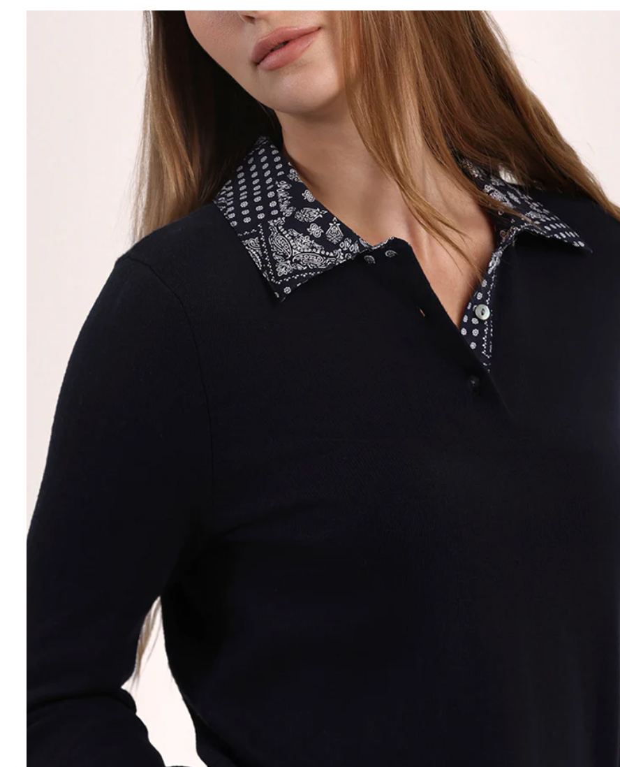 The Cotton Cashmere Woven Bandana Collar Pullover brings serious personality with a playful twist—thanks to its unique bandana-style collar and ultra-soft cotton cashmere yarn.