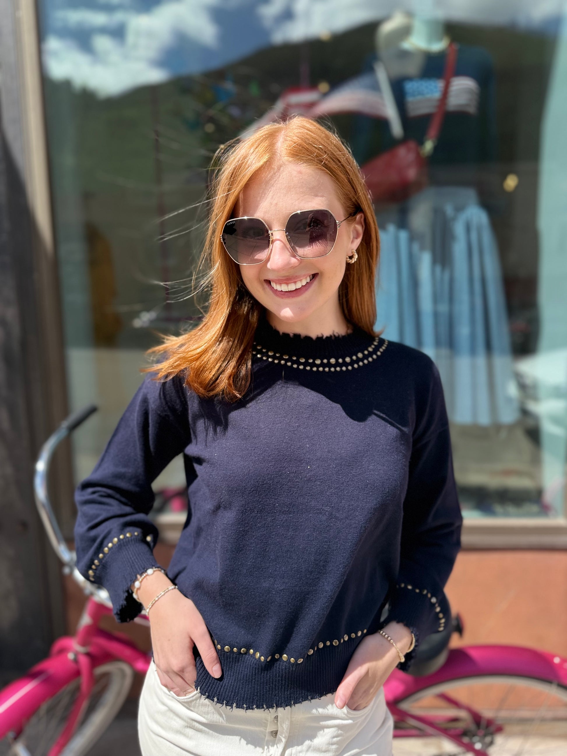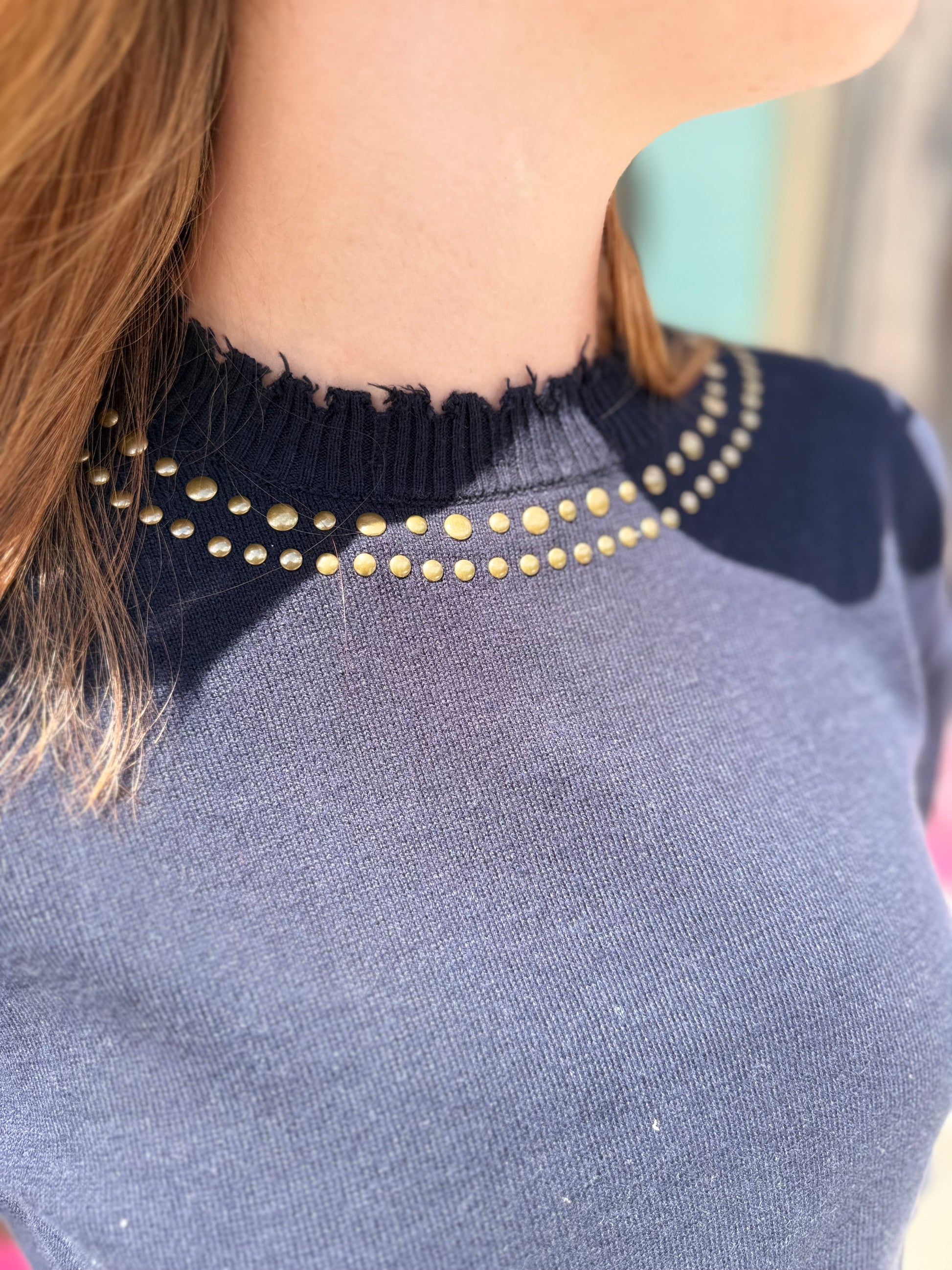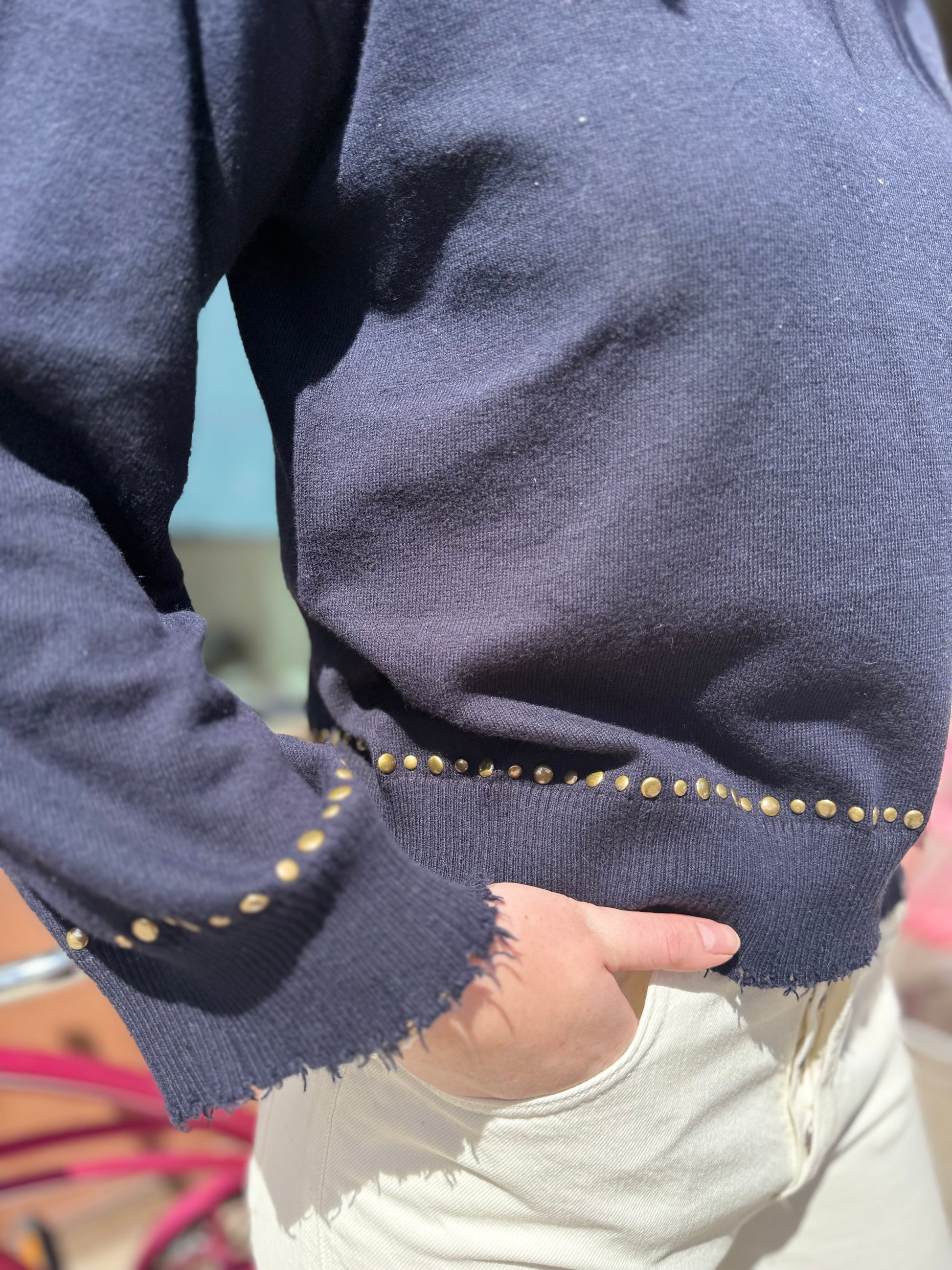 Cotton and cashmere blend frayed crew with bell sleeves by Minnie Rose.