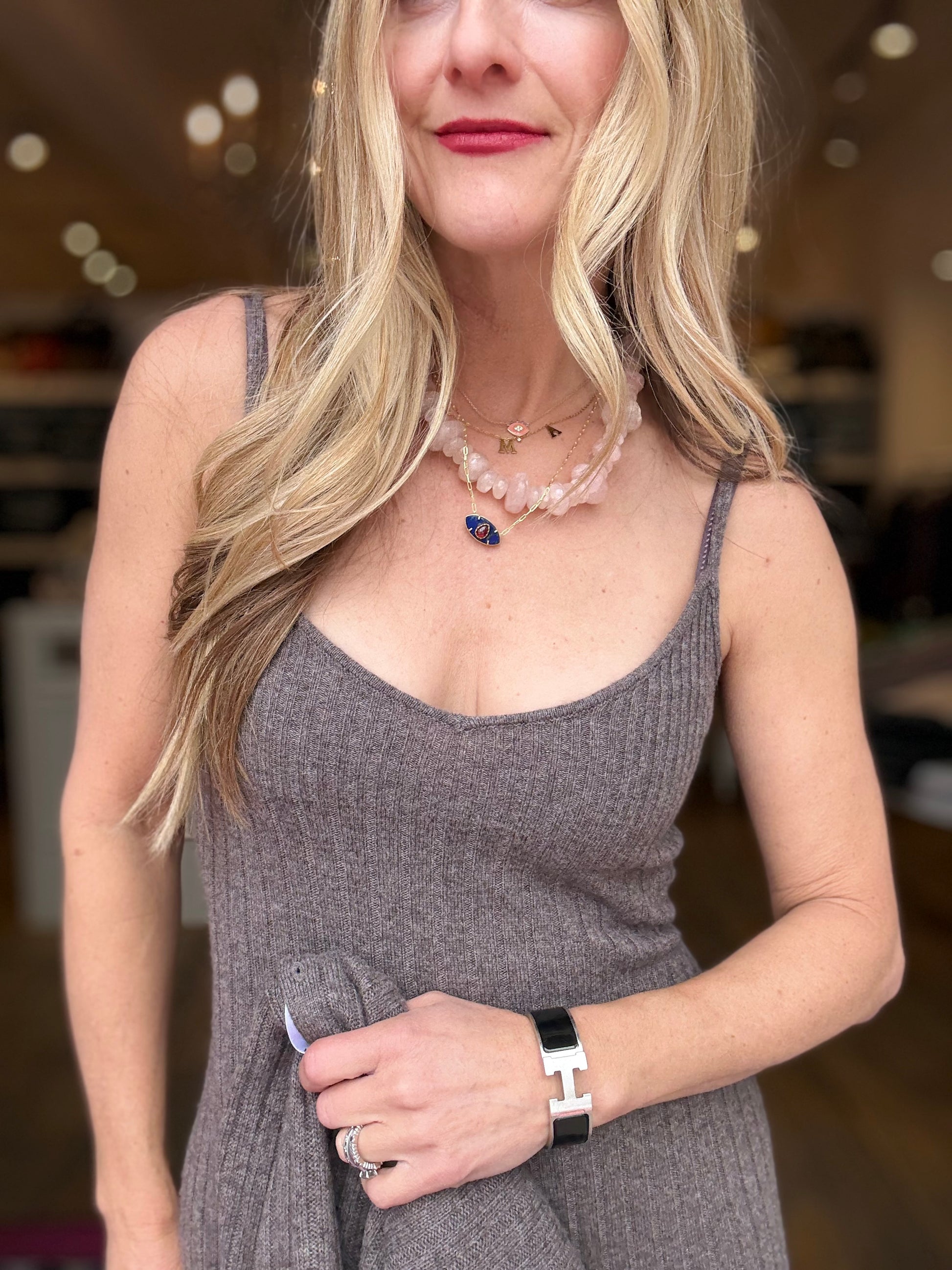 Naadam Cashmere dress set is a ribbed tank dress with matching shrug with sleeves and button neck.