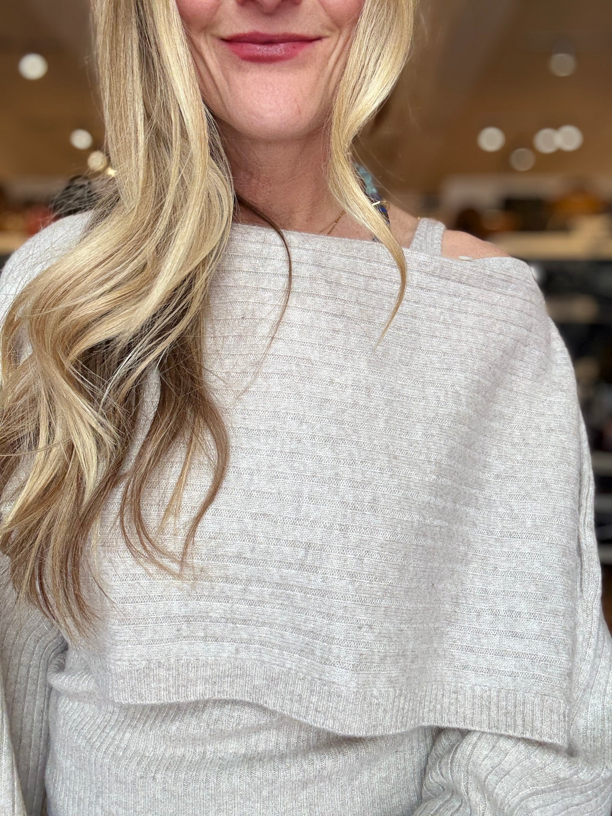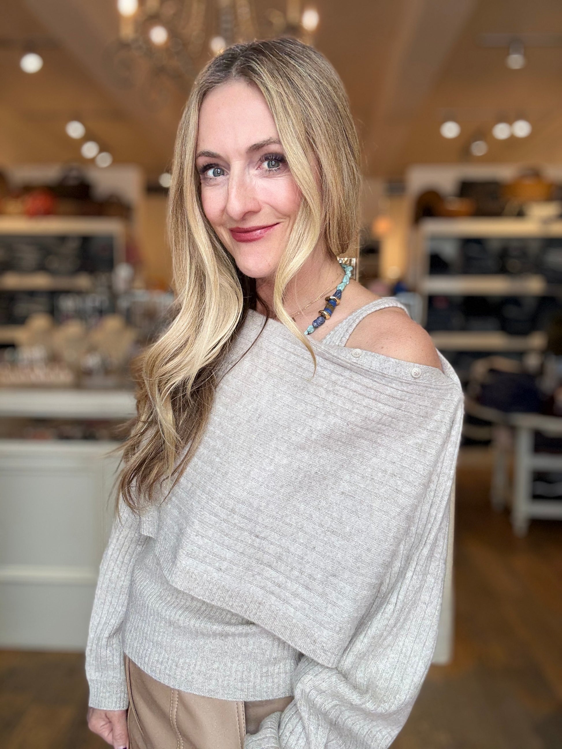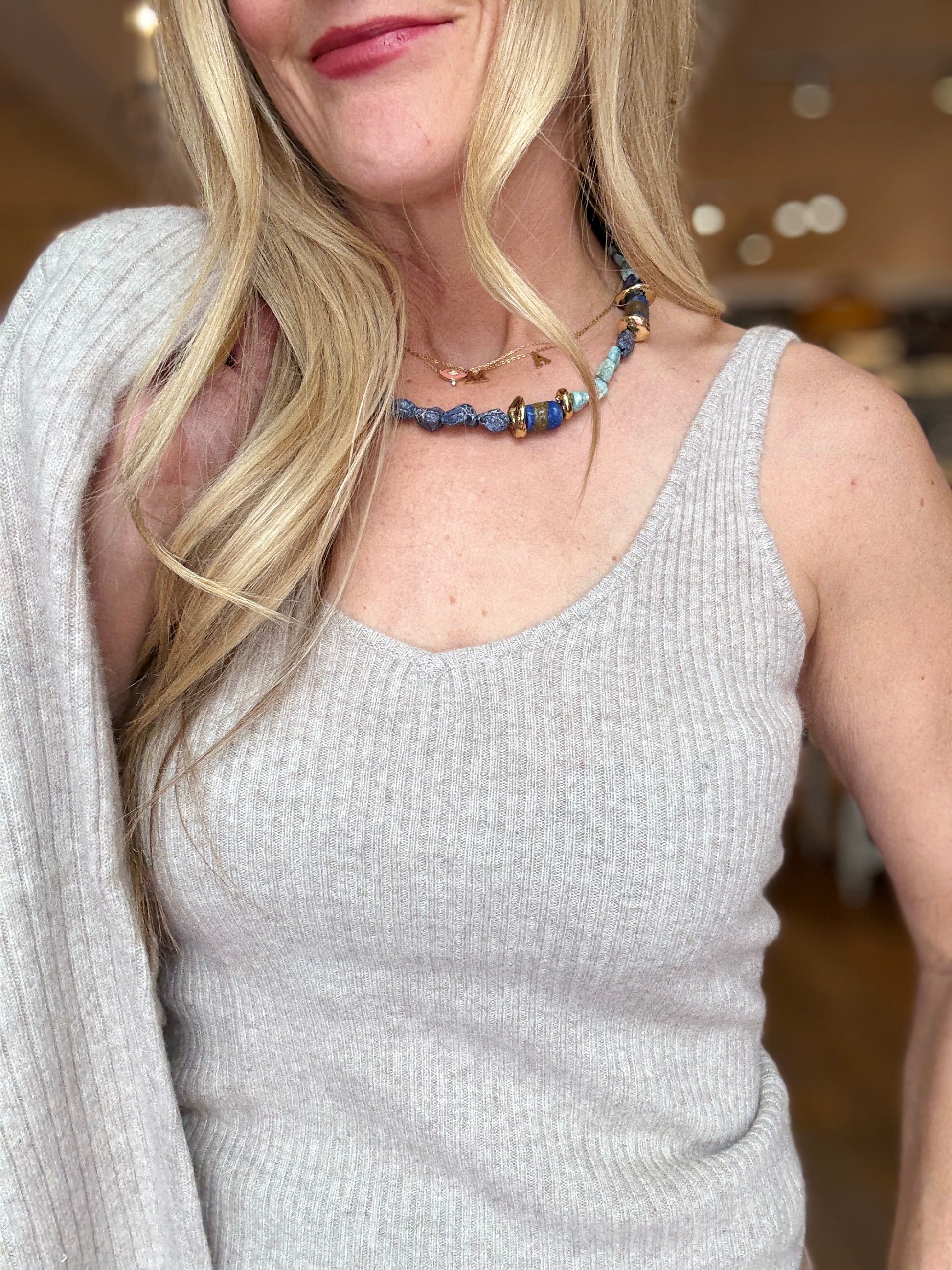 Naadam cashmere 2 piece set is a ribbed tank and a ribbed cropped shrug with sleeves and button neck.