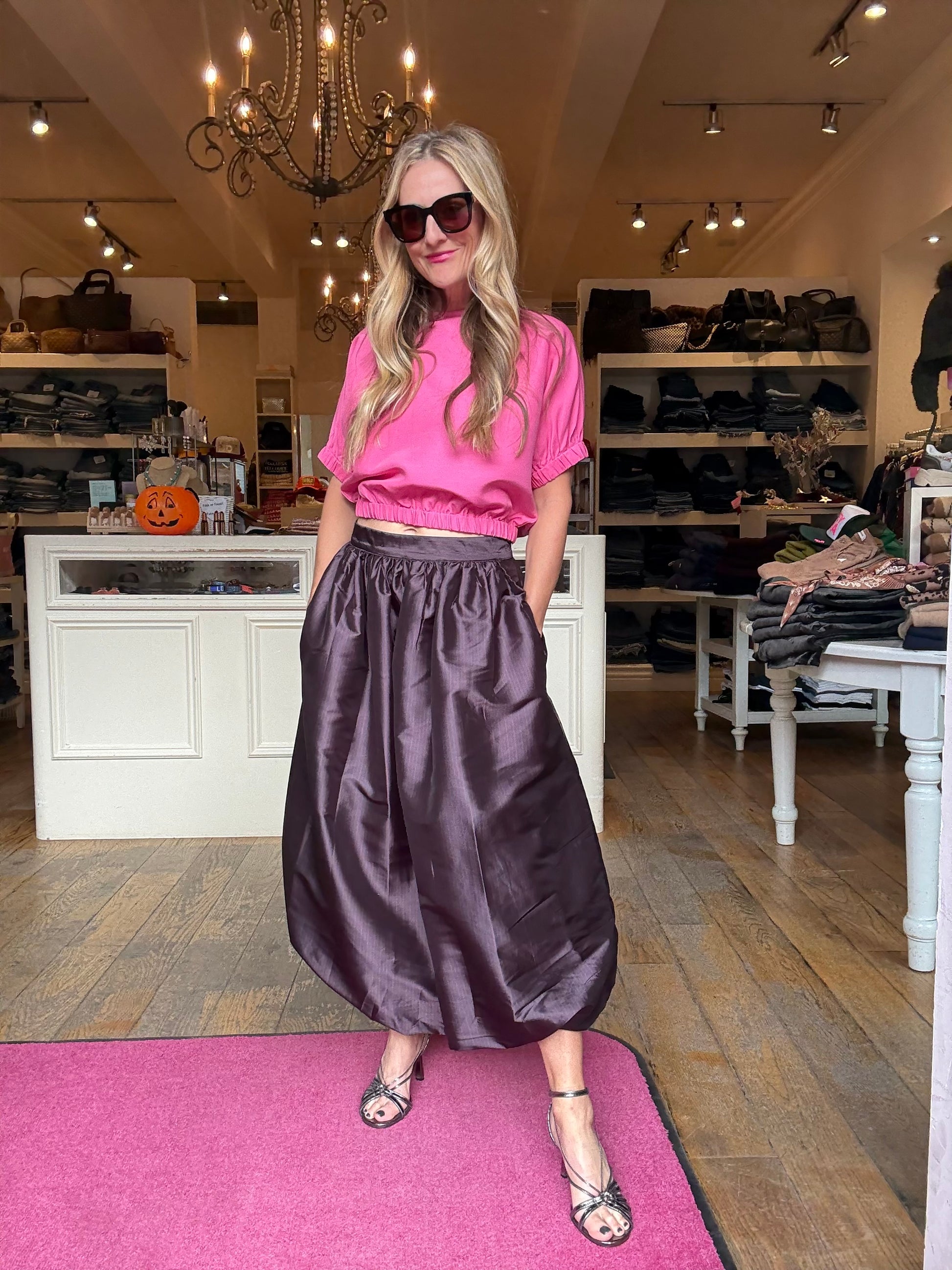 For the complete set, style with NAW Peplum Top or pink bubble top.