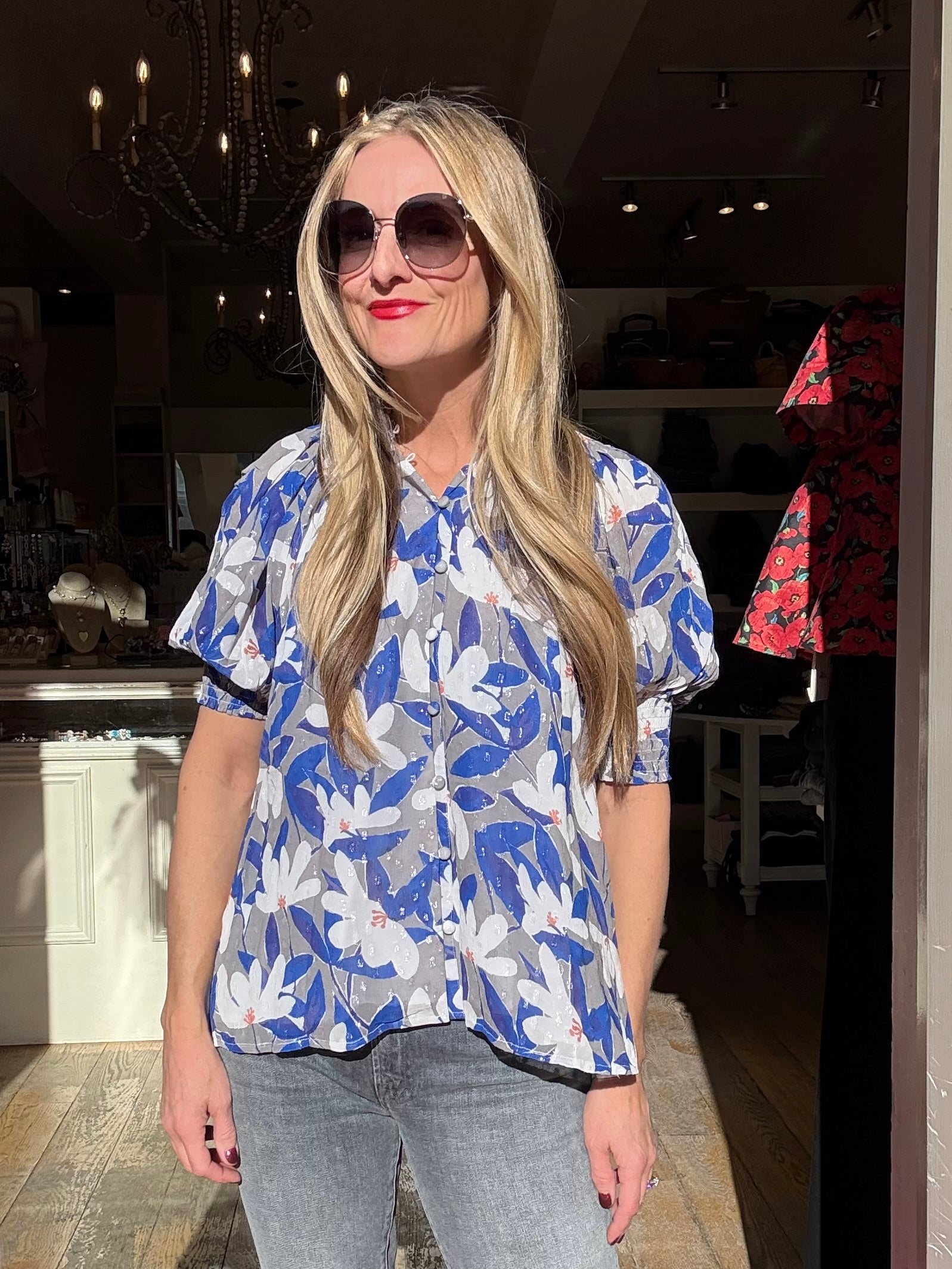 Introducing the Gathered Button Down Top in Paperwhite, a delicate and timeless piece that adds a touch of elegance to your wardrobe. This top features a relaxed fit, making it both comfortable and chic. The gathered design is complemented by short puff sleeves with elasticated cuffs, bringing a playful yet sophisticated charm to the look. The front button closure and ruffled collar add classic details, while the Paperwhite print offers a subtle texture that enhances the overall aesthetic. Perfect for pairing with your favorite jeans or skirts.