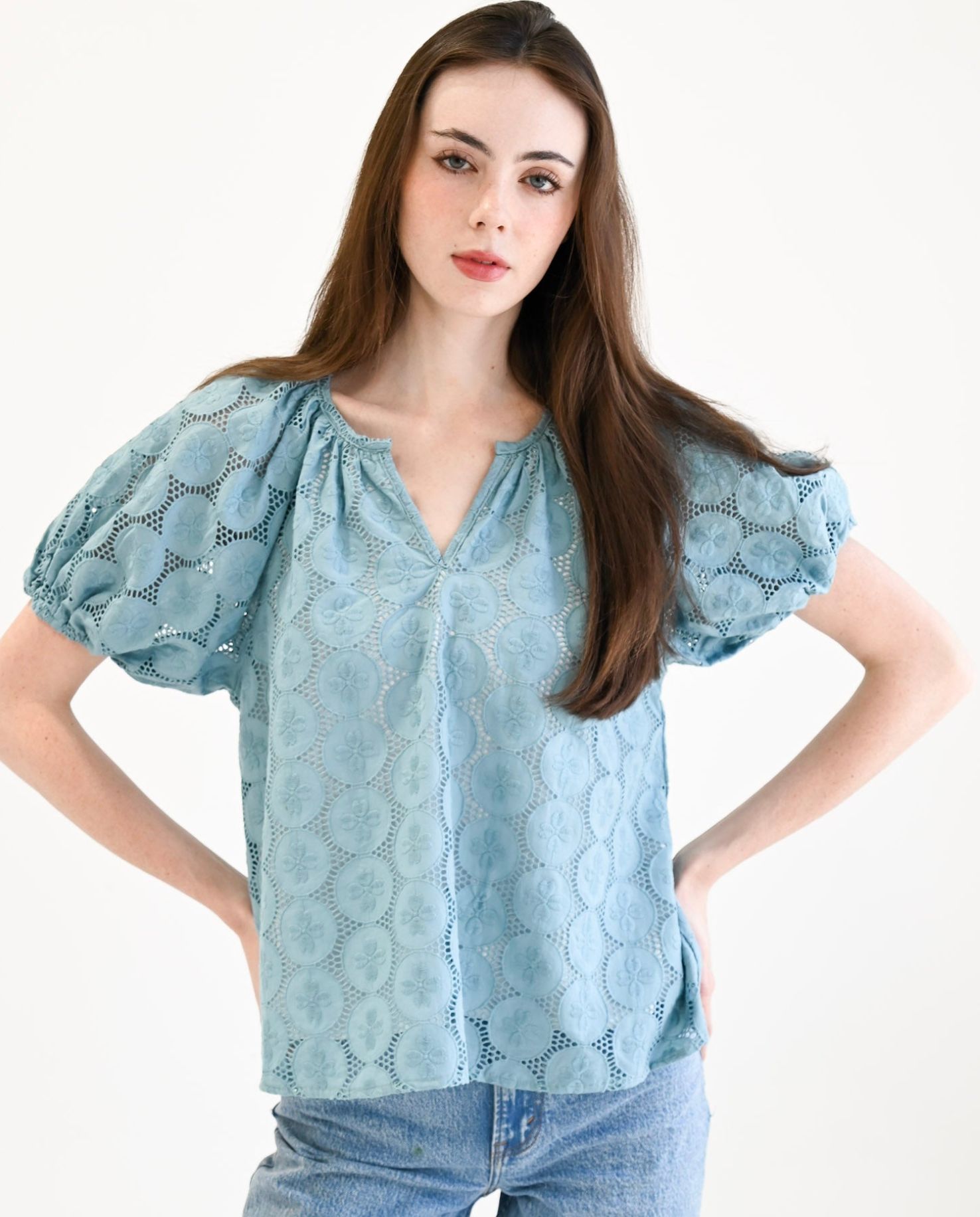 This stylish top features a flattering v-neckline and short puff sleeves, adding a touch of elegance and playfulness to your look. The relaxed fit ensures all-day comfort, making it perfect for any occasion. Crafted from eyelet fabric, this top stands out with its classic yet contemporary design. Pair it with your favorite jeans or tailored trousers for a polished and fashionable ensemble that transitions effortlessly from day to night.