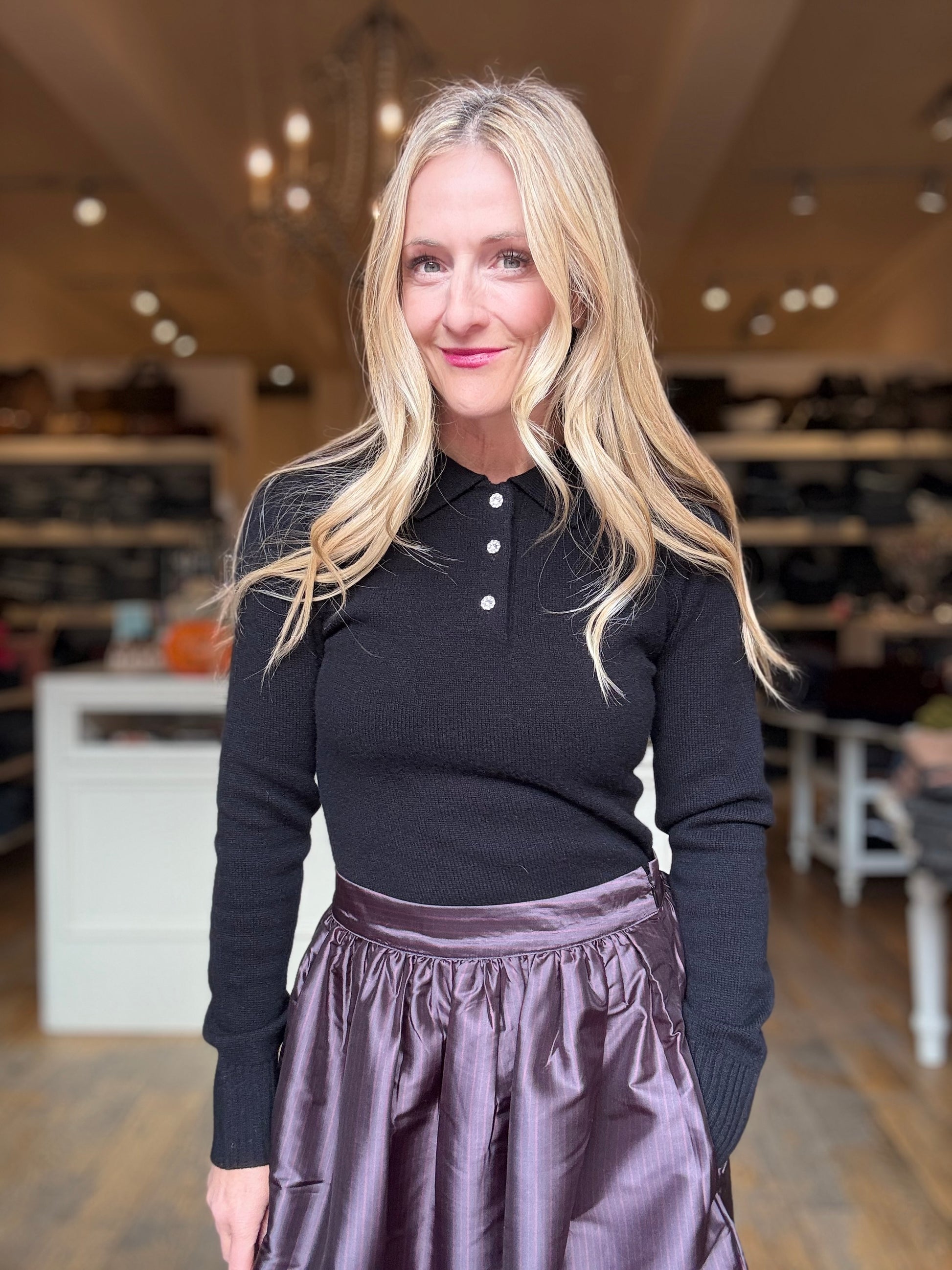 Henley style button down Sweater with Rhinestone Buttons. Cashmere wool blend.
