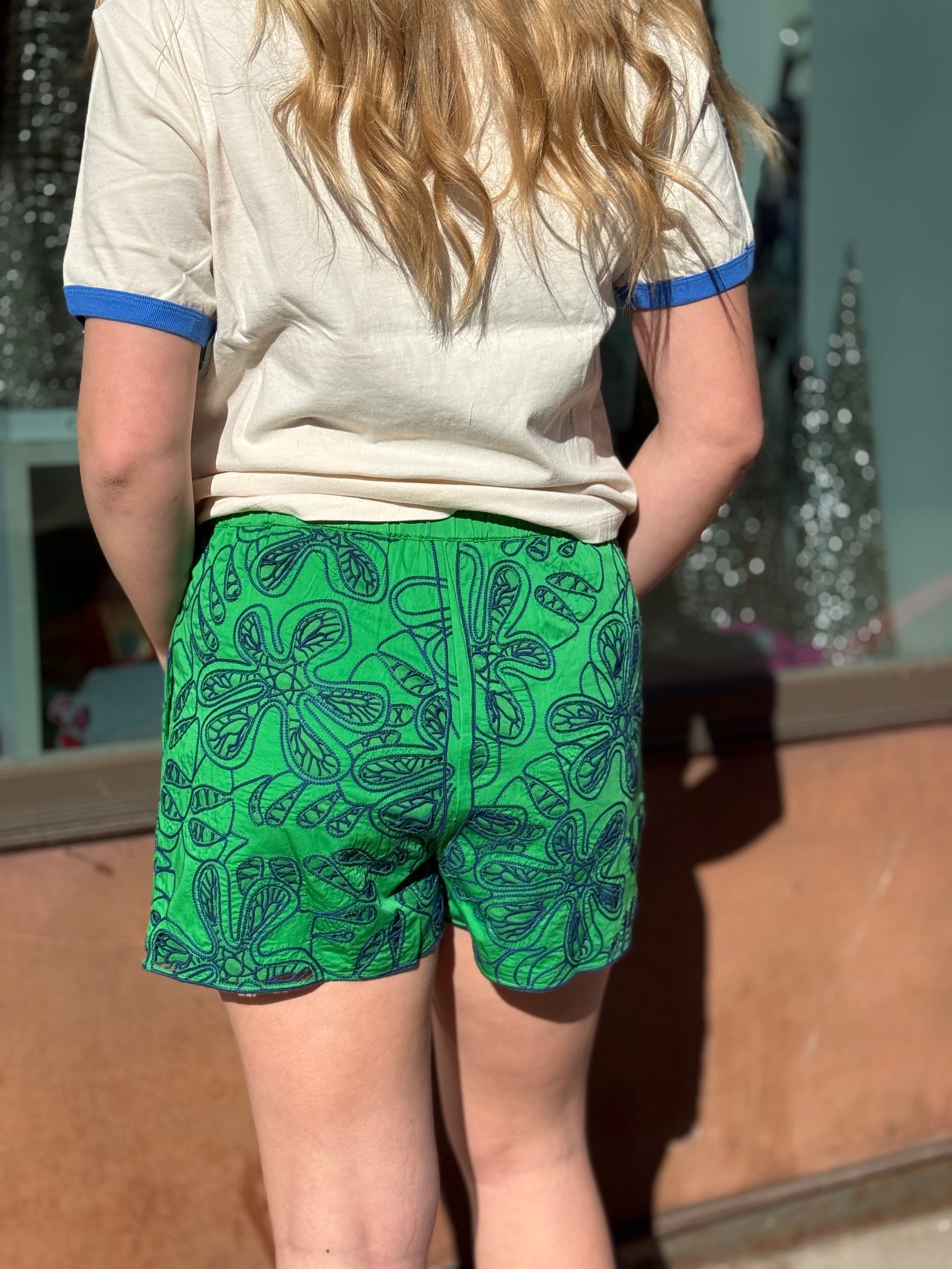 This mini skort is crafted from lightweight cotton and detailed with intricate cutwork embroidery in kelly green and navy, creating a stunning floral and geometric design along the panels. The high-waisted fit and softly flared silhouette offer comfort and ease of movement, while the semi-sheer embroidered sections add a modern, sophisticated edge. Perfect for pairing with a simple top or the matching embroidered blouse for a coordinated look.