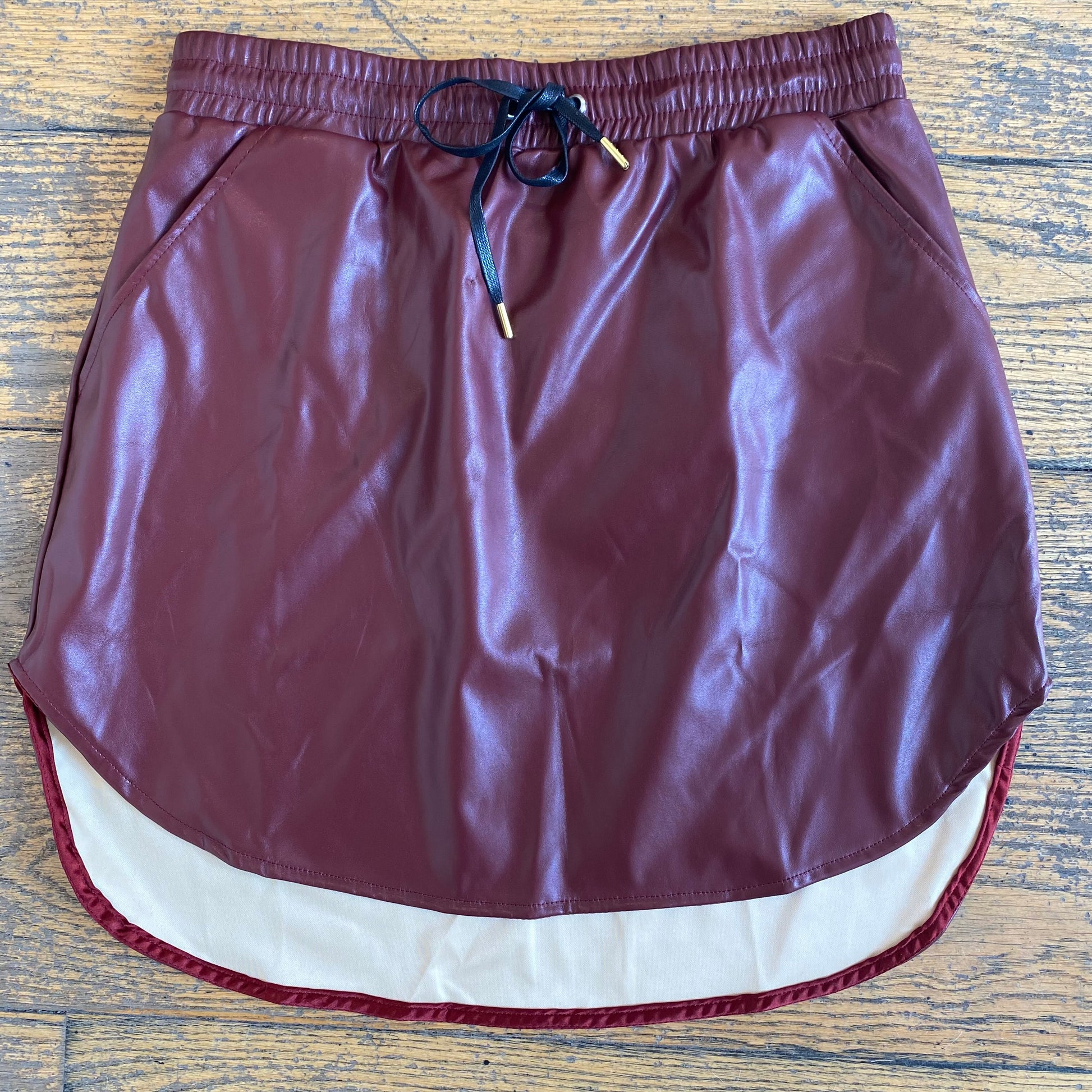 Faux leather electric waist drawstring mini skirt in burgundy. Front pockets.