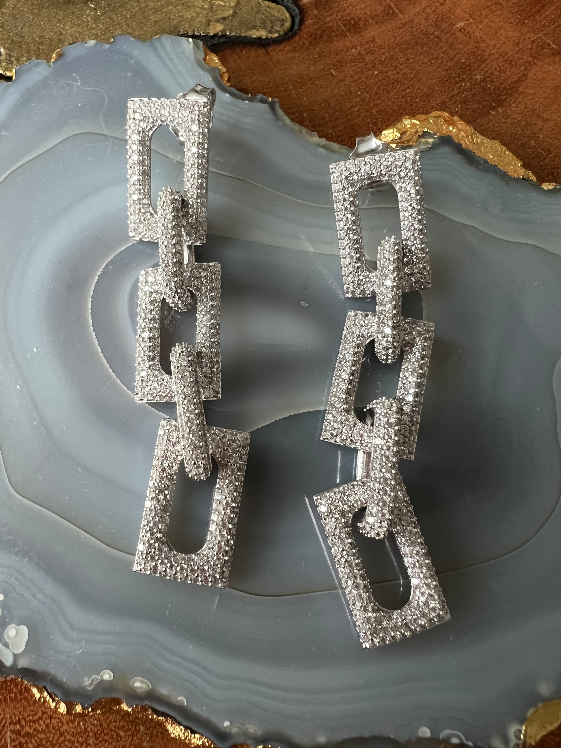 Crafted with square chain adorned with pavé diamond cut crystals, these earrings exude a dazzling sparkle.