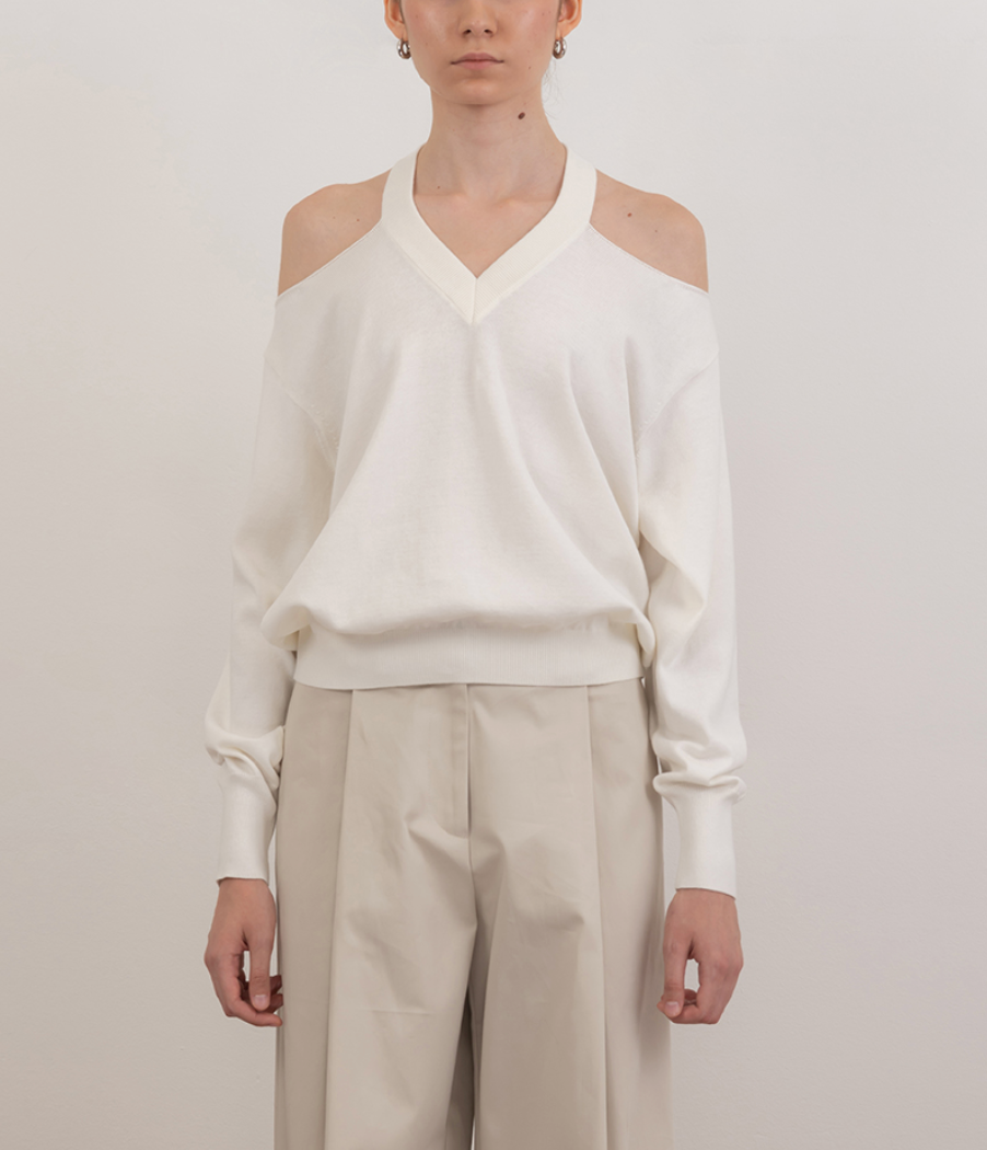 Long sleeve v-neck knit sweater with open shoulders. Large wrist cuff.