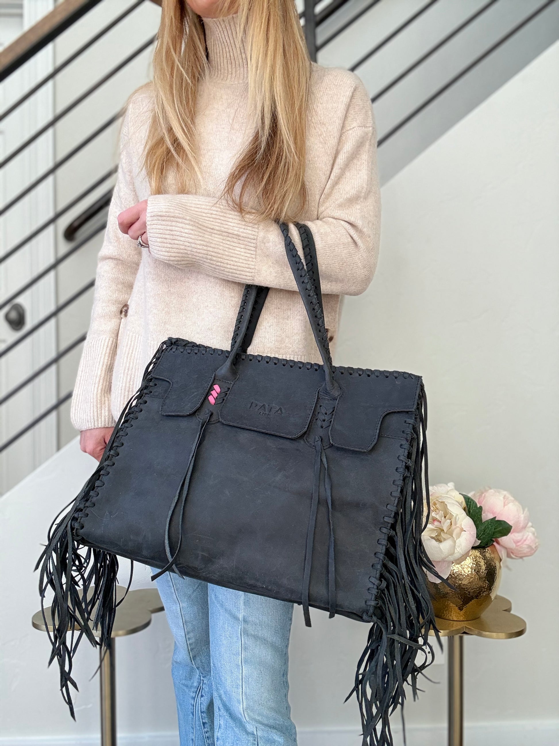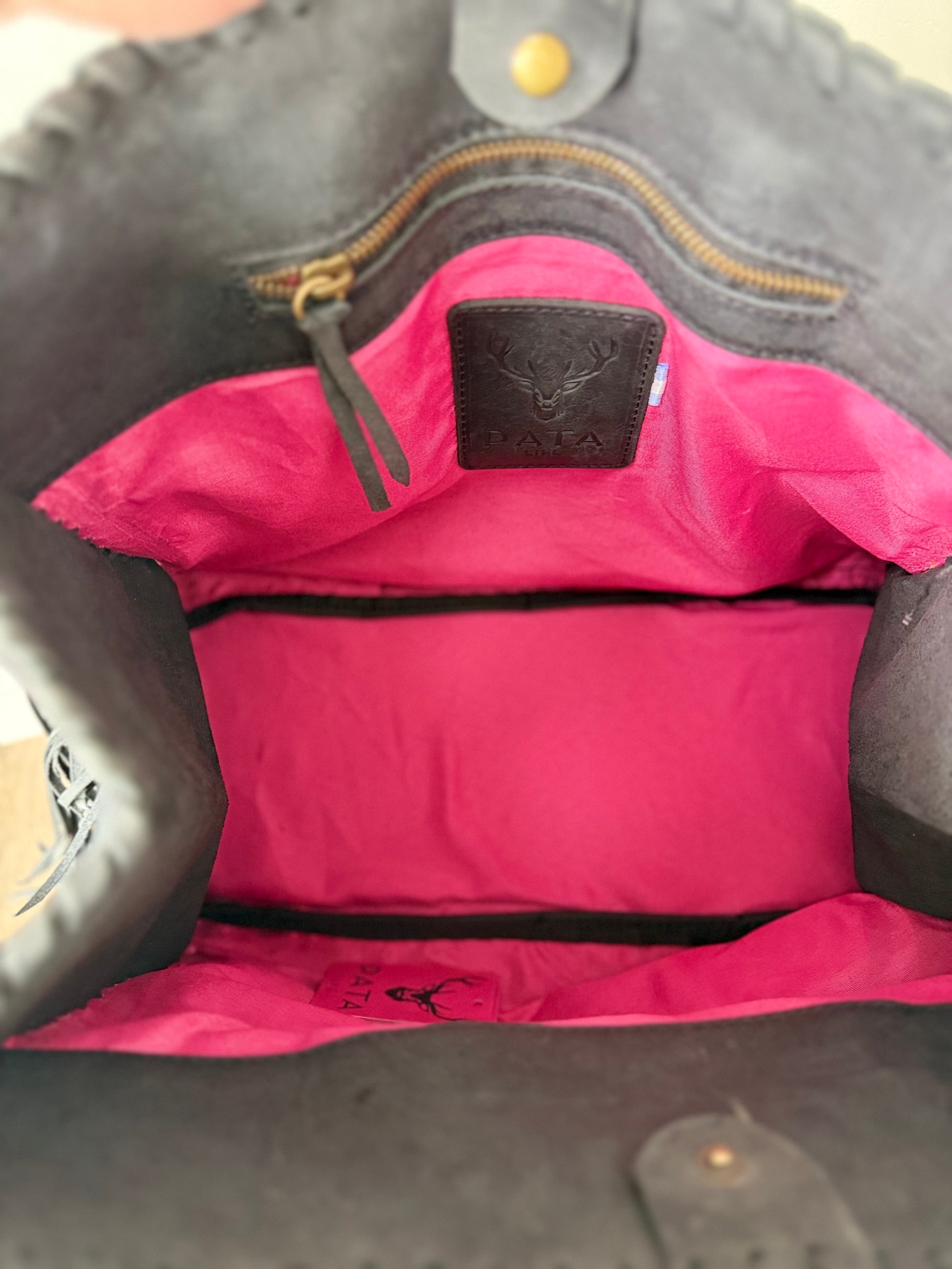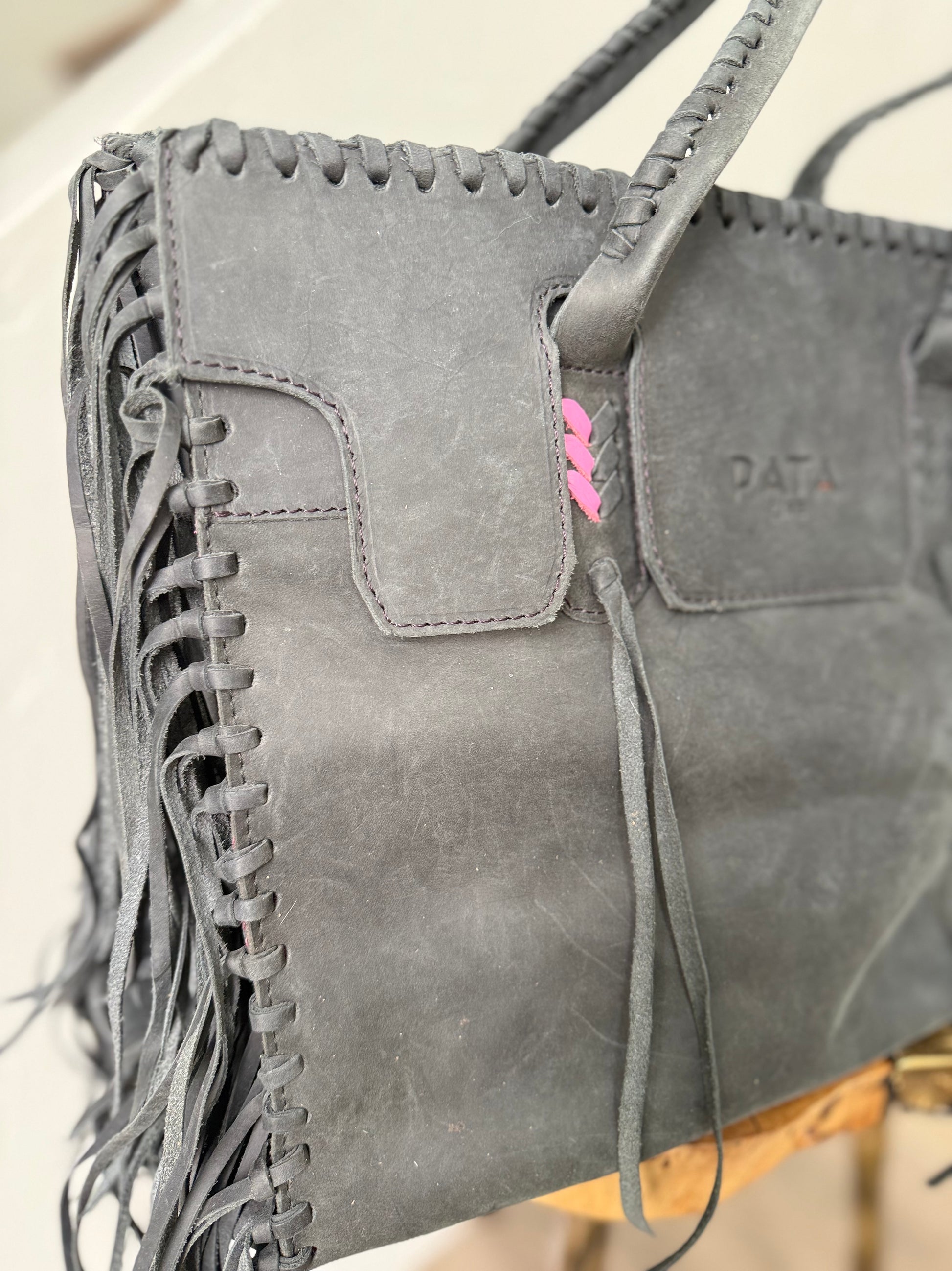 Oxidized black leather Bag with fringes on the side and Pata Pink linen interior. Super durable, the leather just gets better over time. Fits perfectly your laptop, makeup bag or anything else you need for your daily active live.