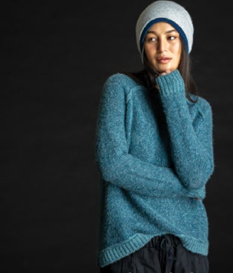 Dreamy 5 gauge cashmere crewneck sweater in marled ocean teal.