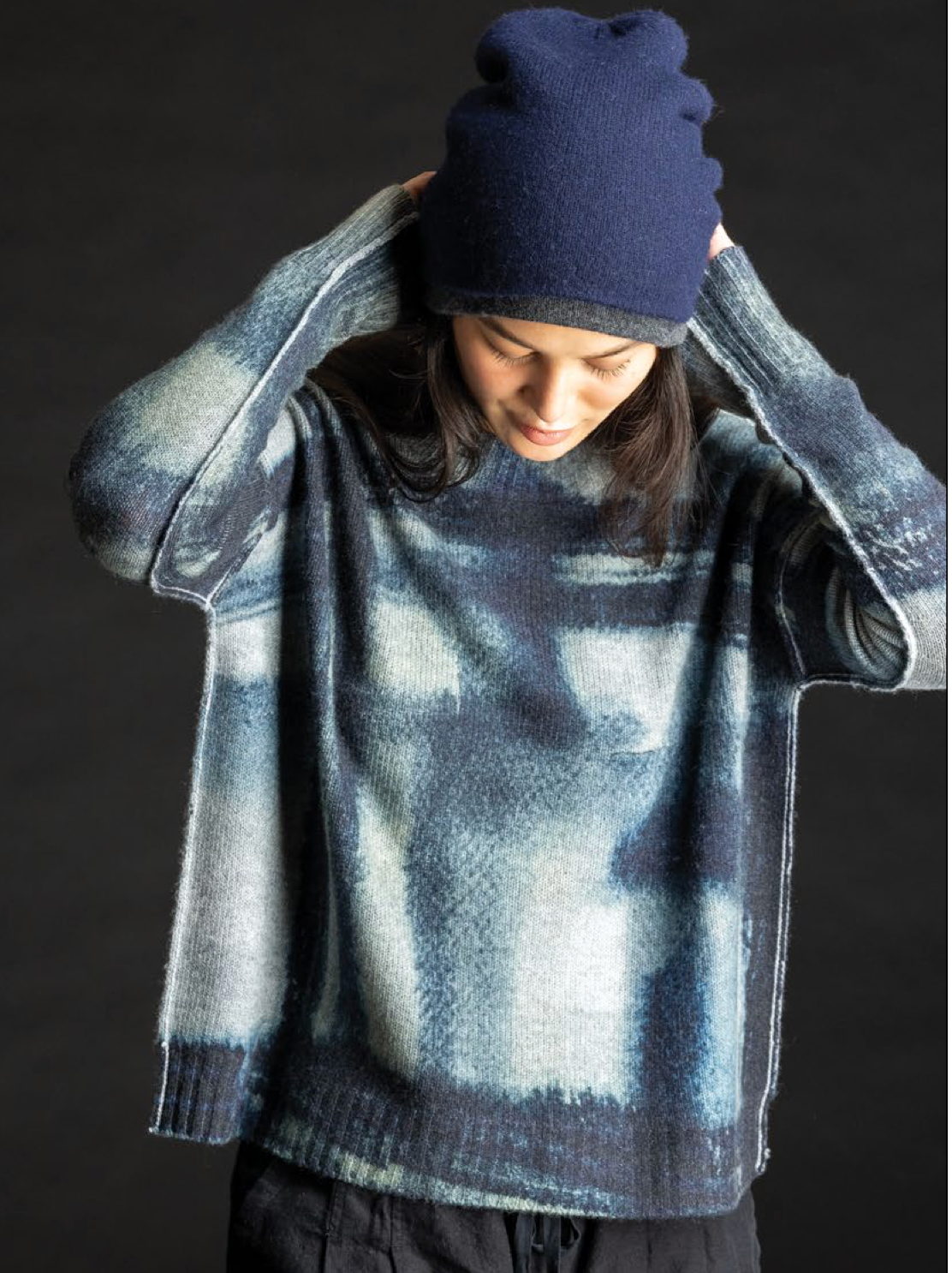 Premium 5 gauge cashmere painted plaid crewneck in indigo blue.