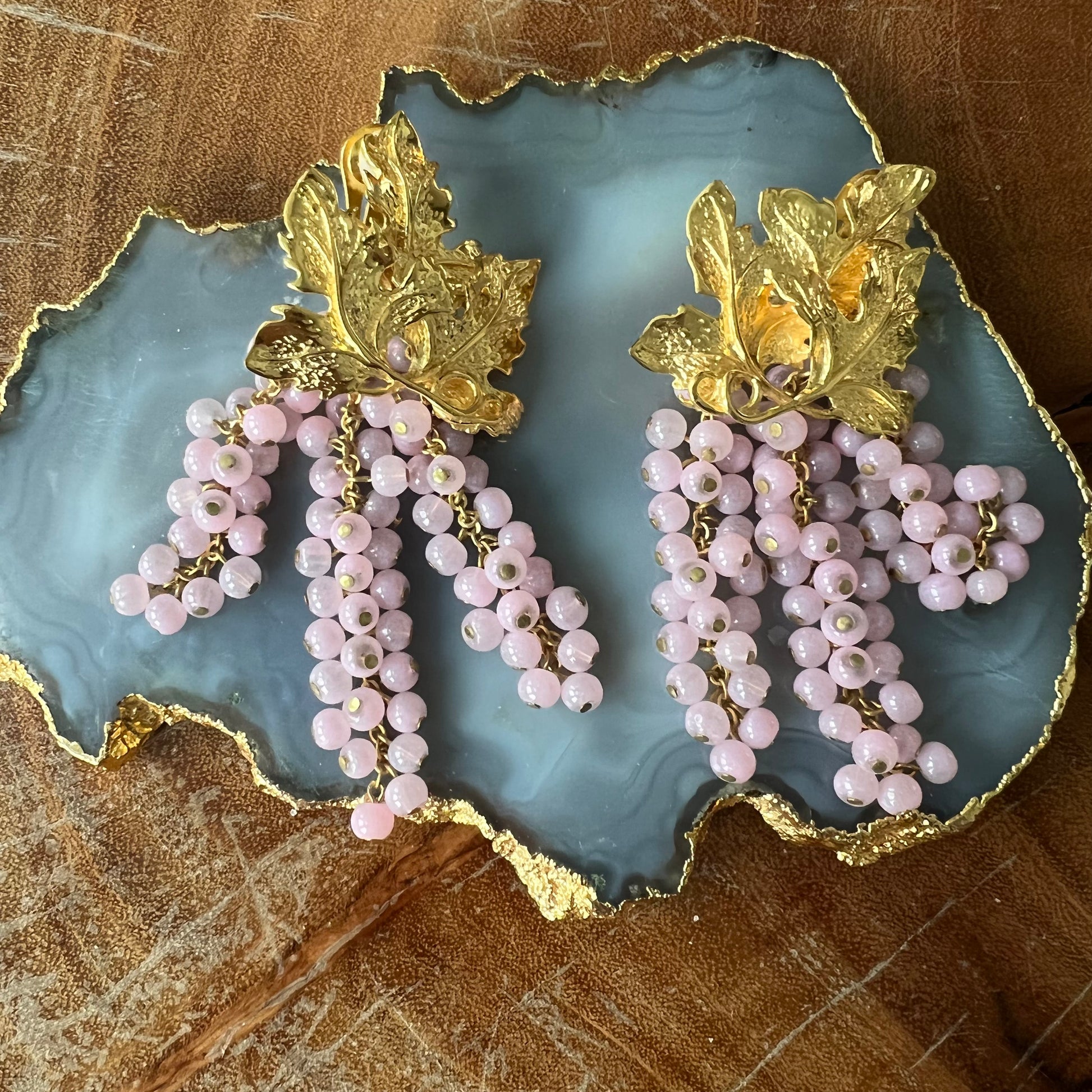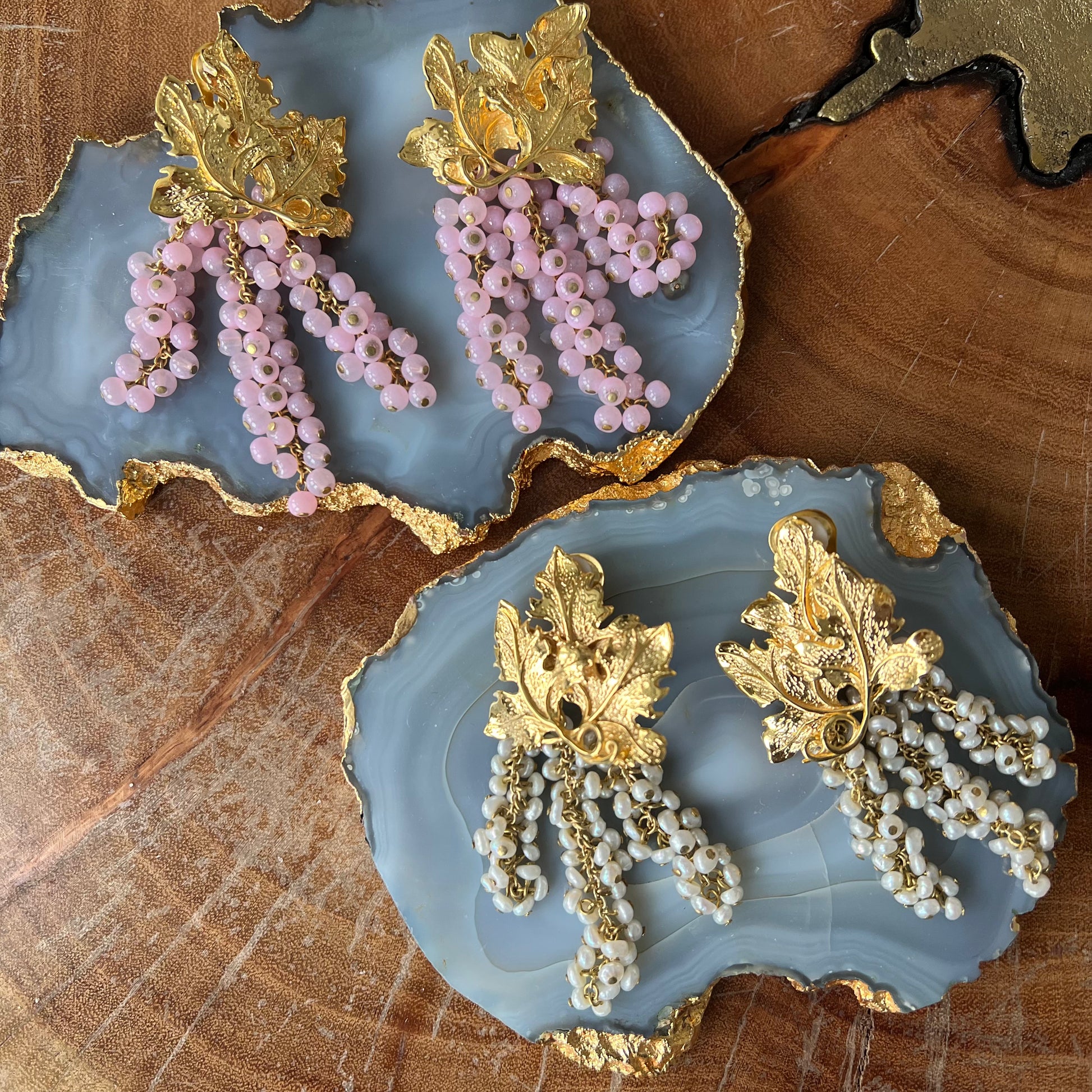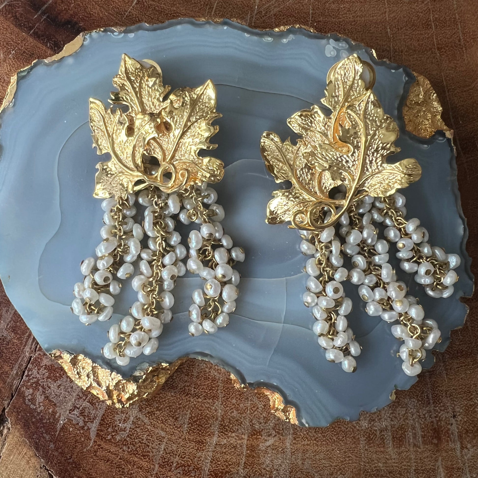 24K Gold played bronze leaf clip on earring with dangling genuine baroque pearls that resemble grapes.
