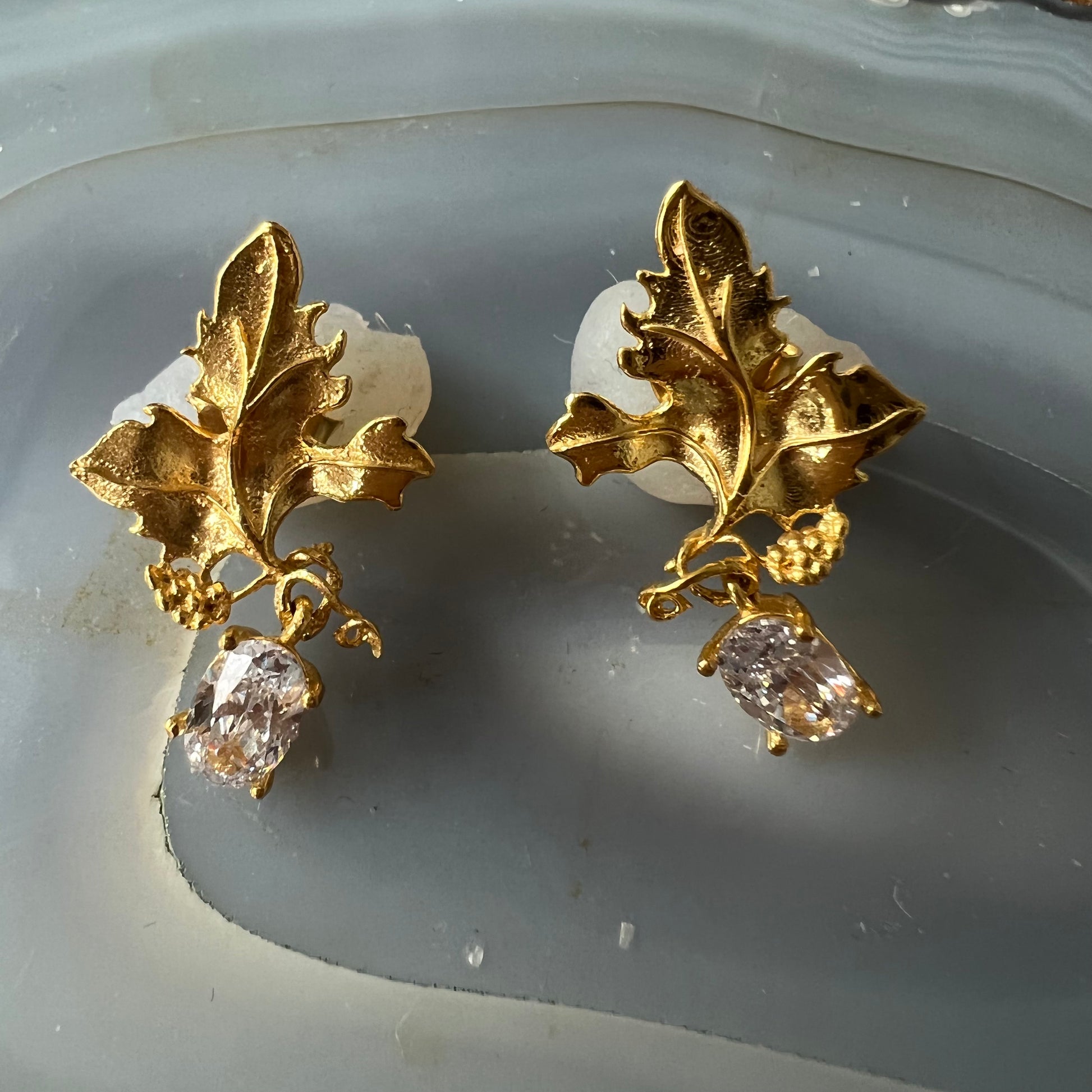 24K gold plated bronze leaf earrings with white Swarovski drops.