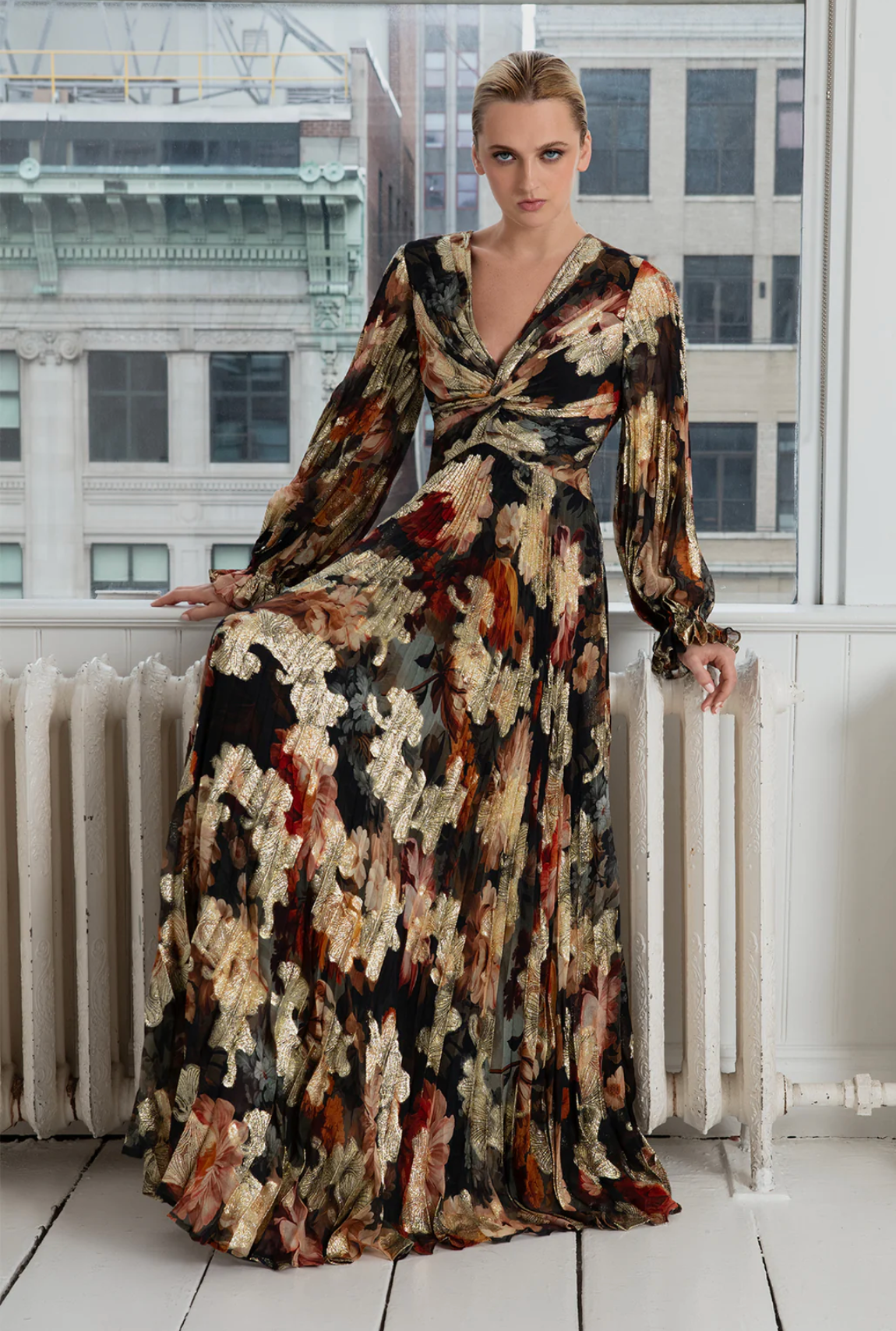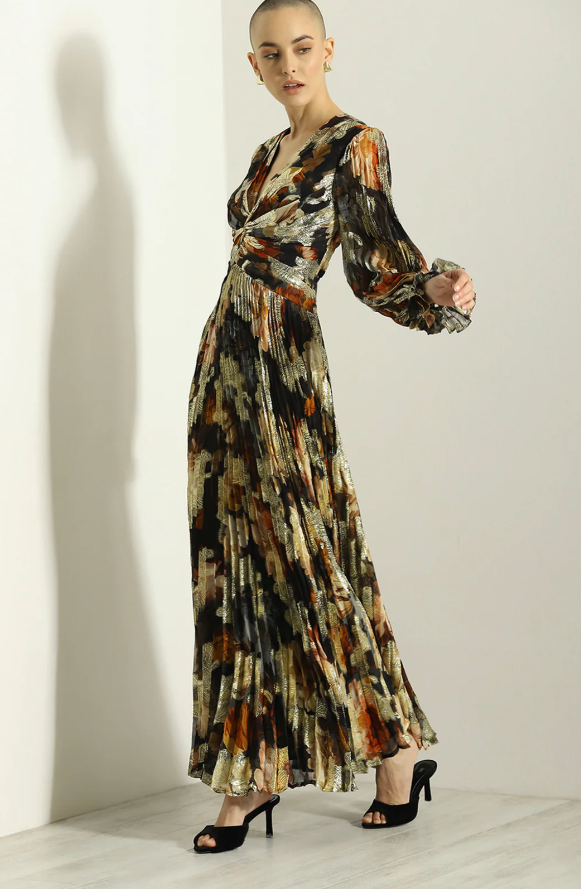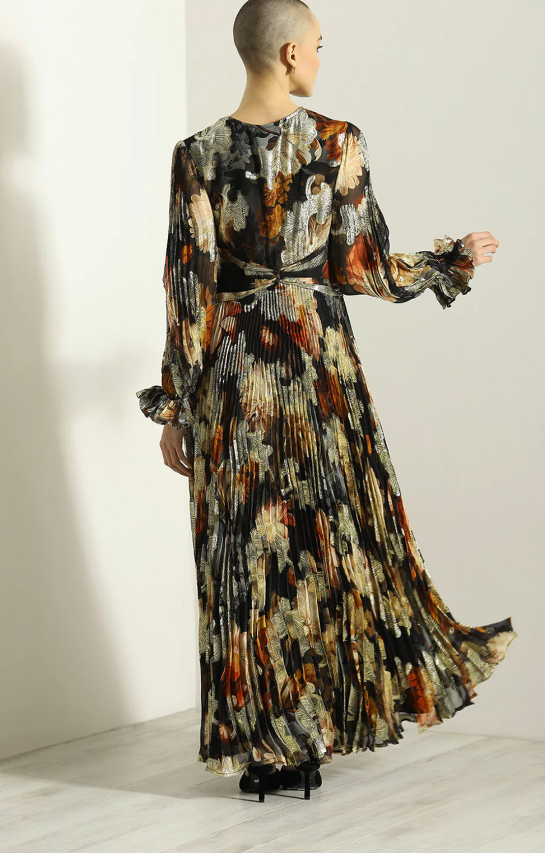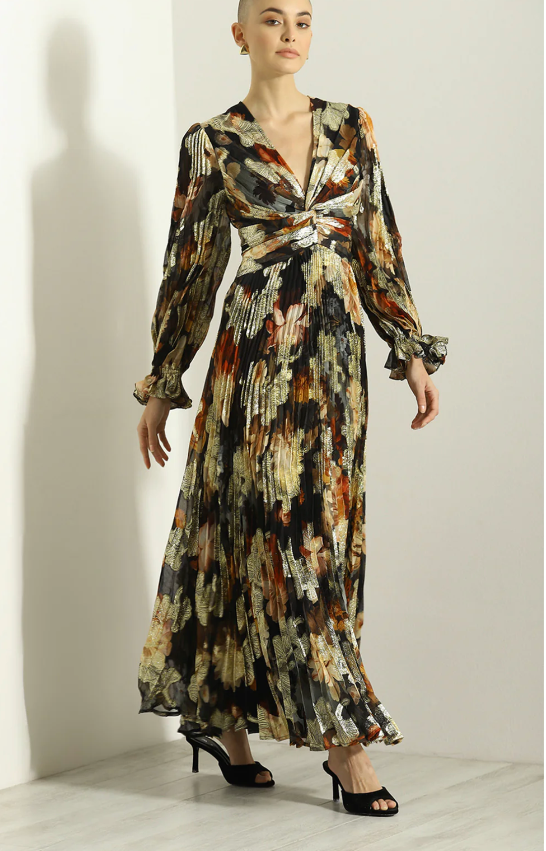 Introducing the TERZA TWISTED PLEATED MAXI DRESS, crafted from lurex georgette fabric, this dress features a soft, shimmering texture adding a touch of glamour. The vibrant Green Peony print is complemented by intricate lurex butta jacquard weave embroidery. The twisted pleated detailing and maxi length.