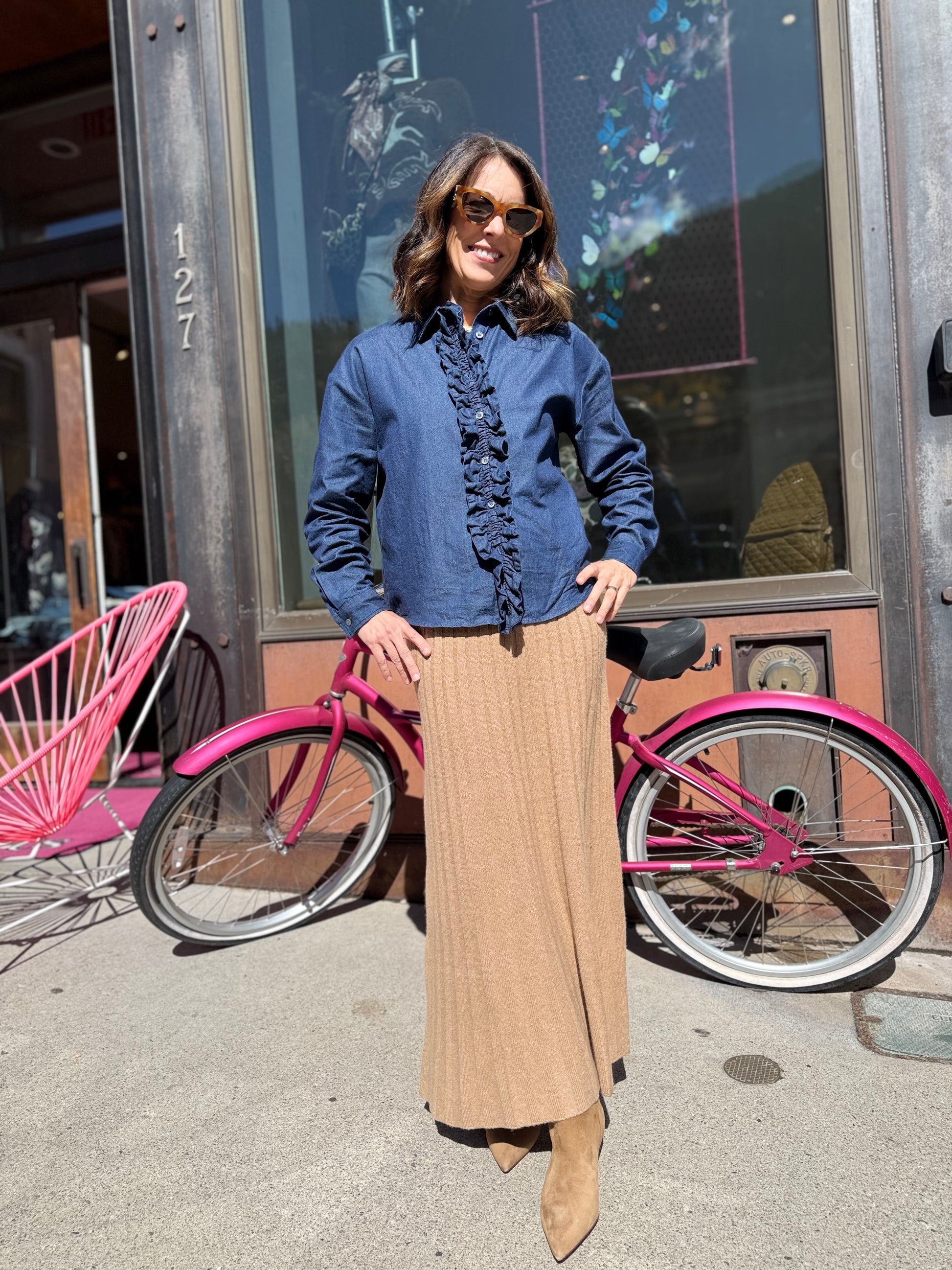 Soft denim chambray shirt with ruffle front. Non stretch and boxy fit.