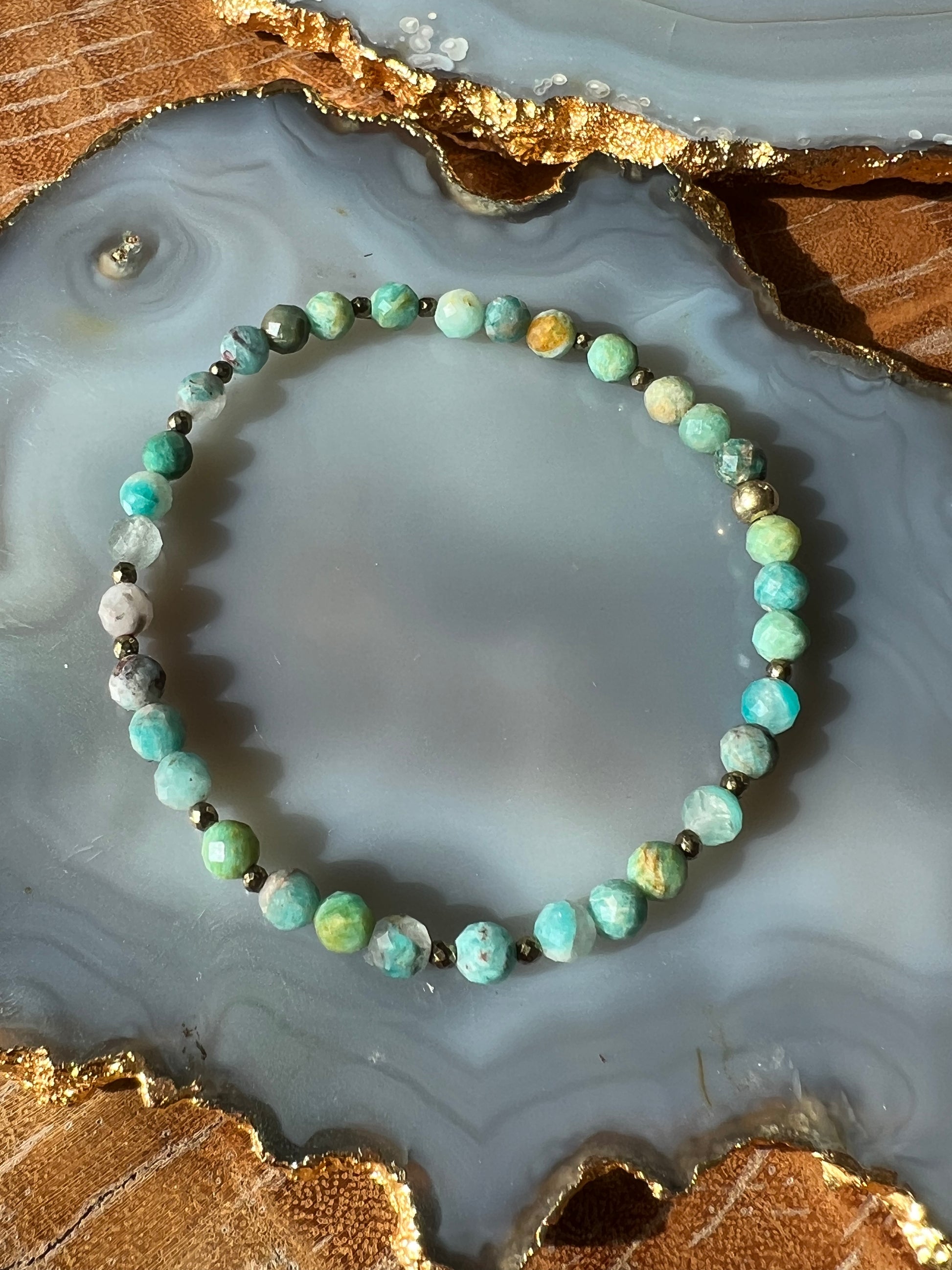4mm sea green Amazonite beads bracelet with pyrite accents.