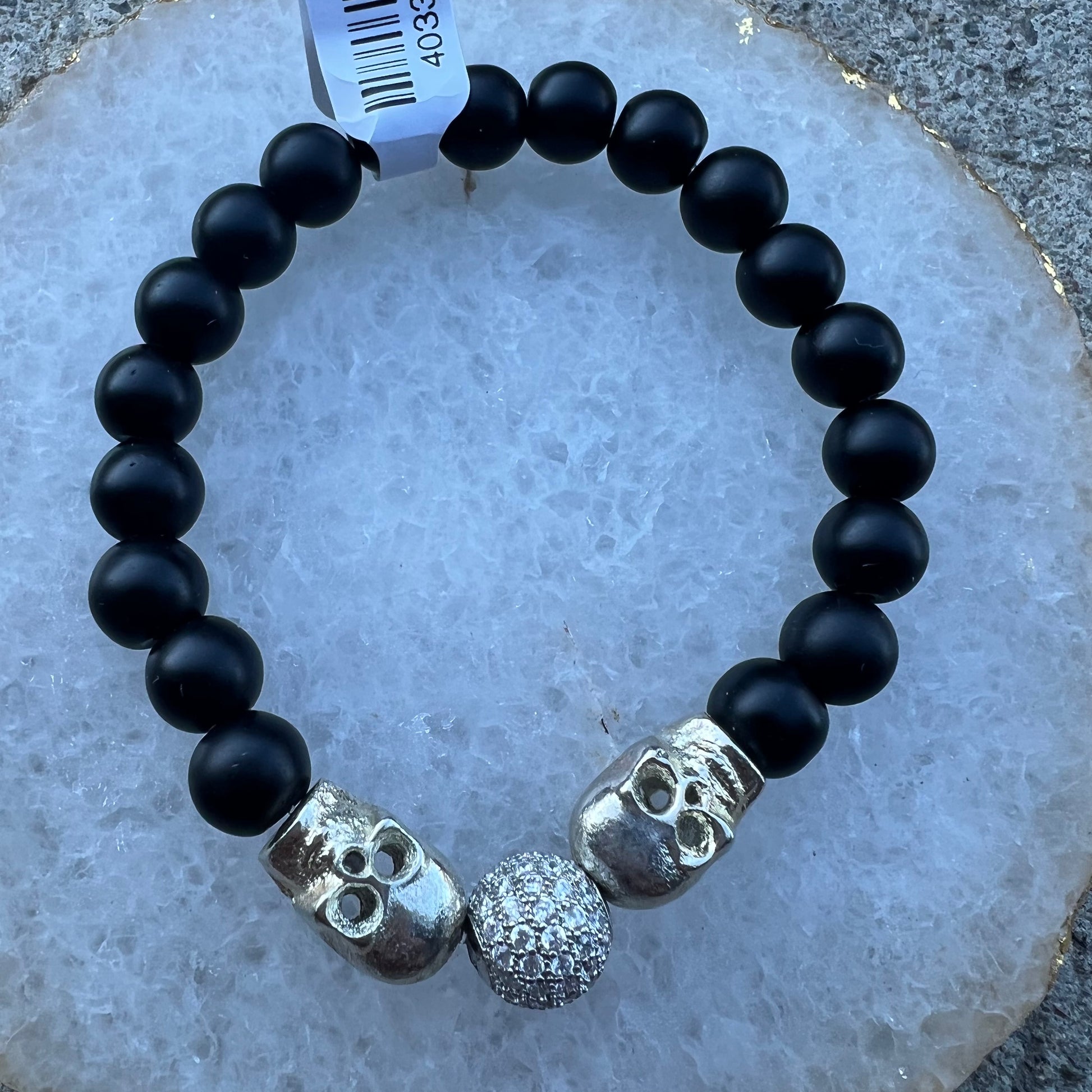 Black onyx beads with 2 silver skulls and pave diamond ball.