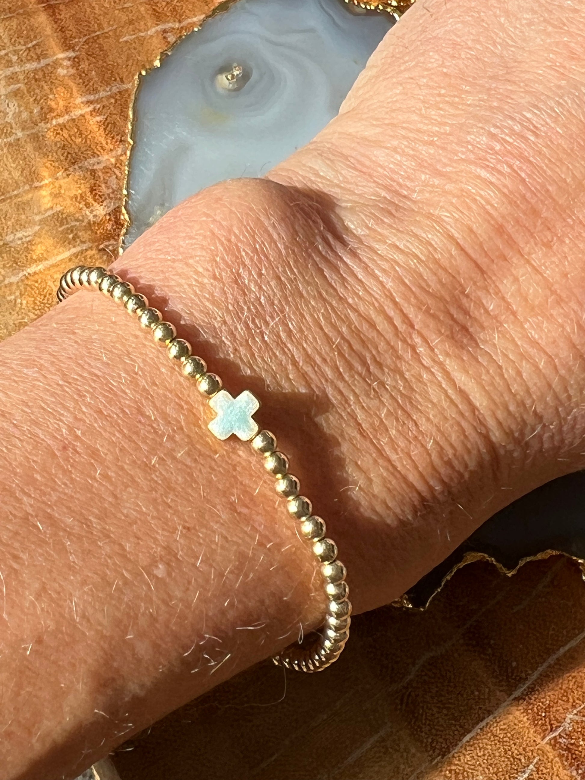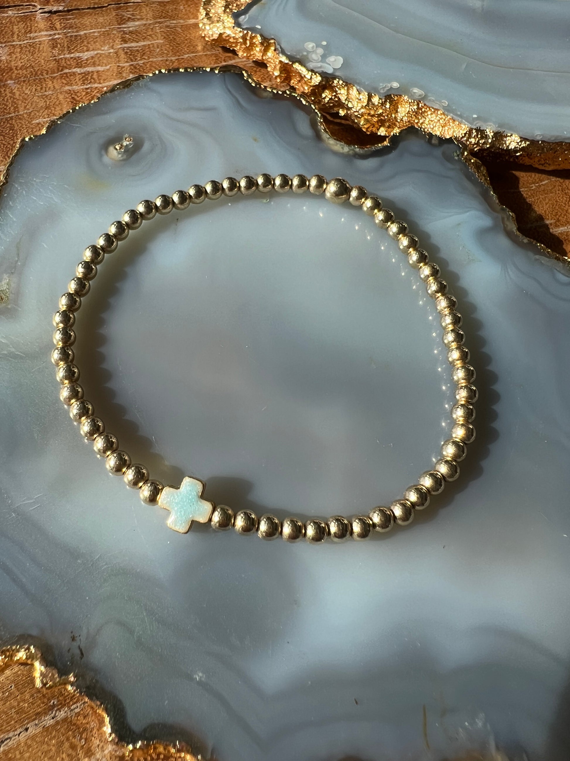 14K gold filled 3mm ball bracelet with blue sparkle enamel cross charm.
