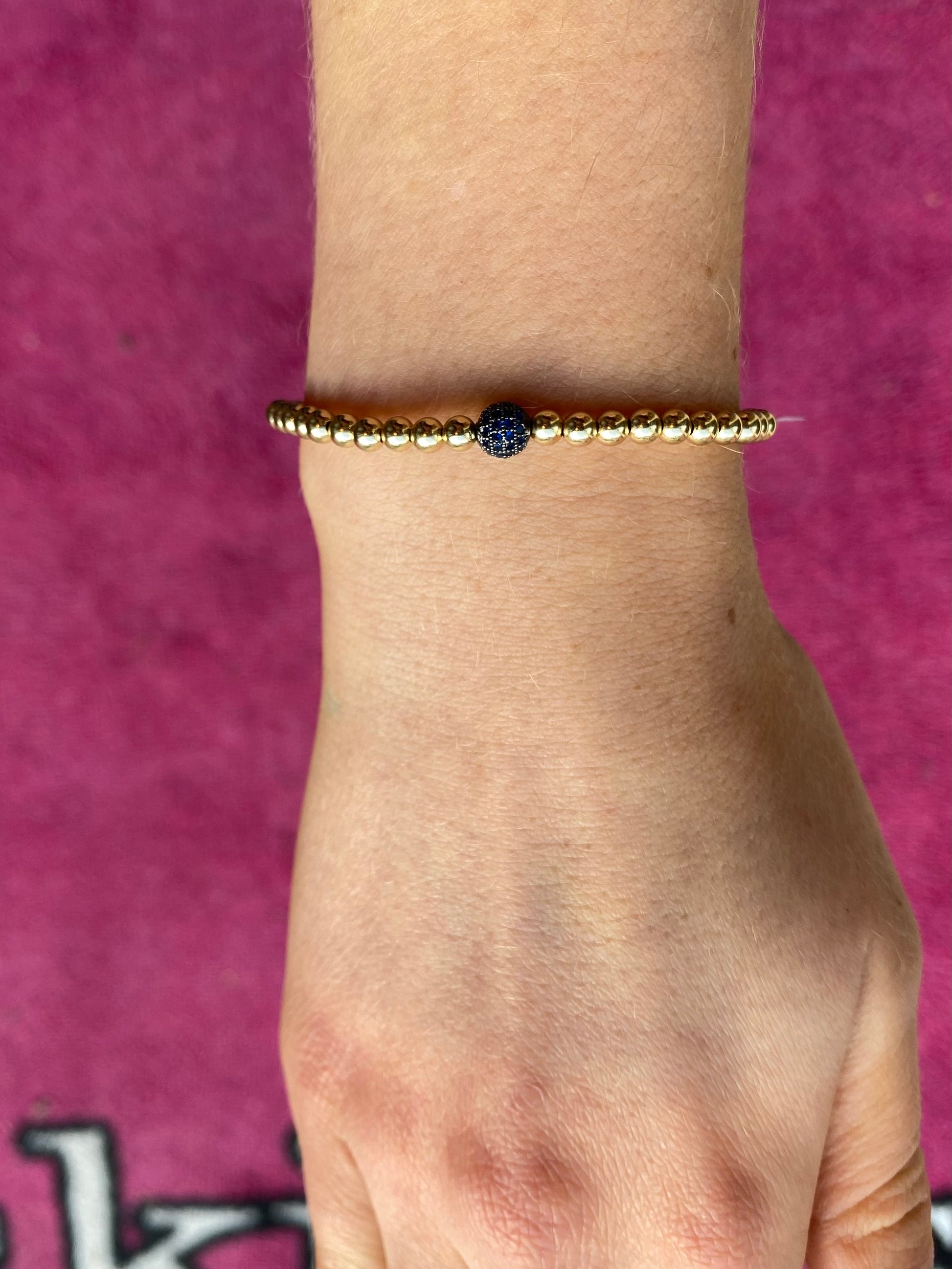 5mm gold ball stretch bracelet with pave diamond dark blue ball.