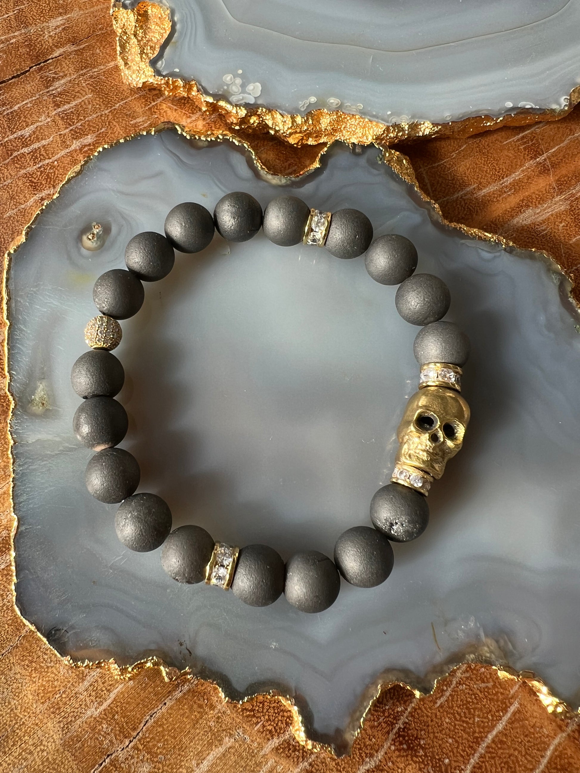 Druzy bead stretch bracelet with pave ball and rondelles and brass skull.