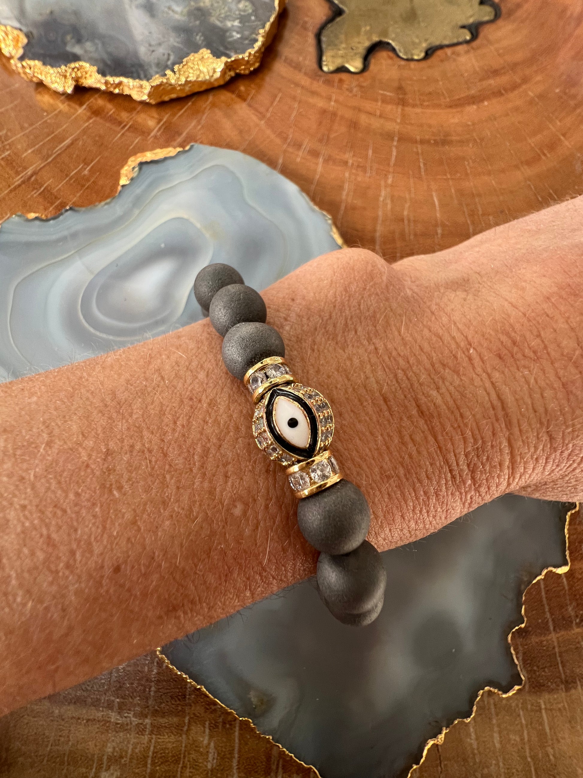 Pave evil eye ball on grey bead stretch bracelet.