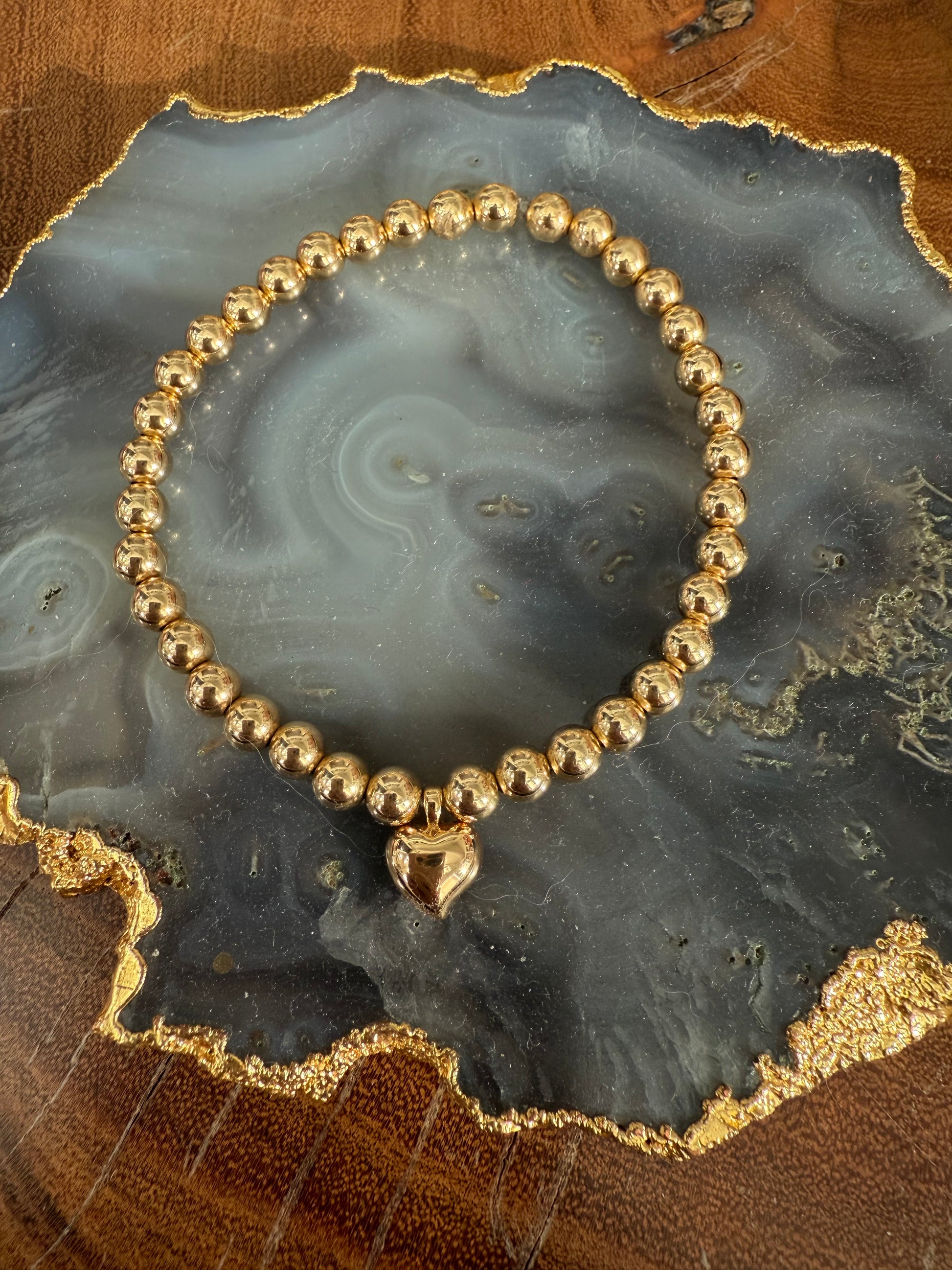 14K Gold Filled 5 mm beaded bracelet with gold heart charm.