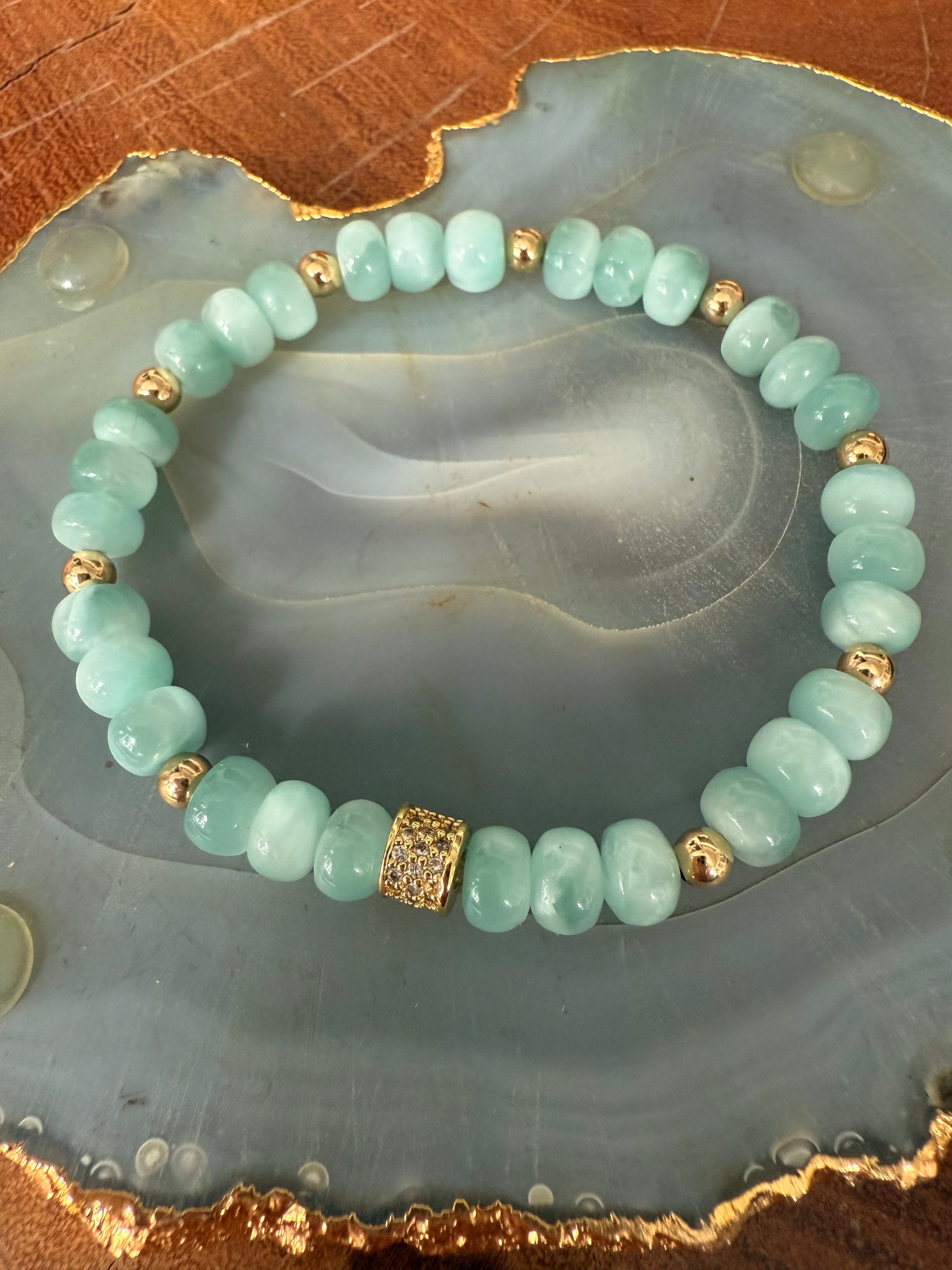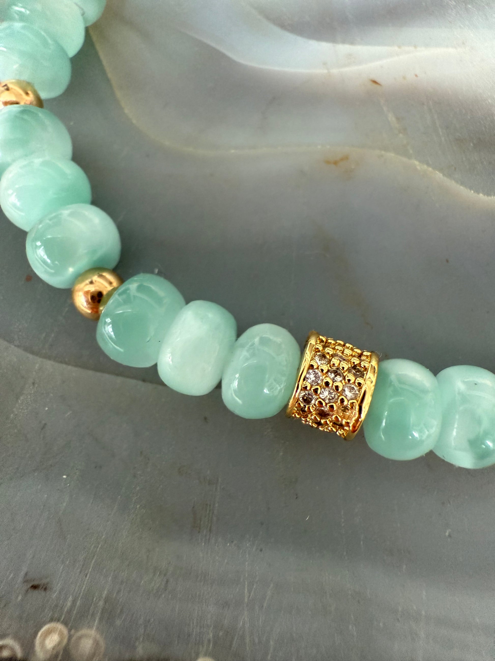 Stretchy green moonstone and gold ball bracelet.