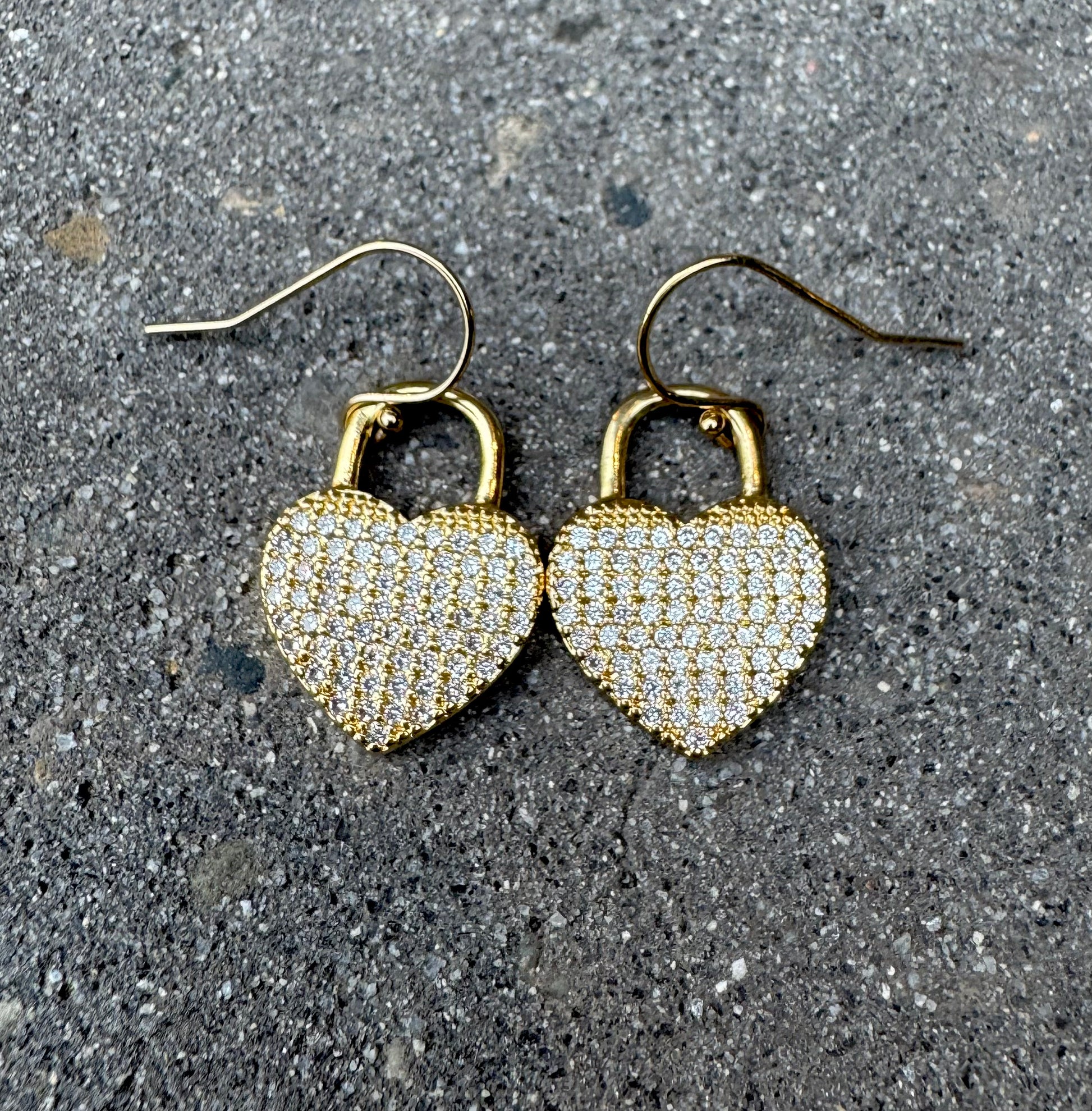 Pave Heart Lock Gold Dangle Earrings
