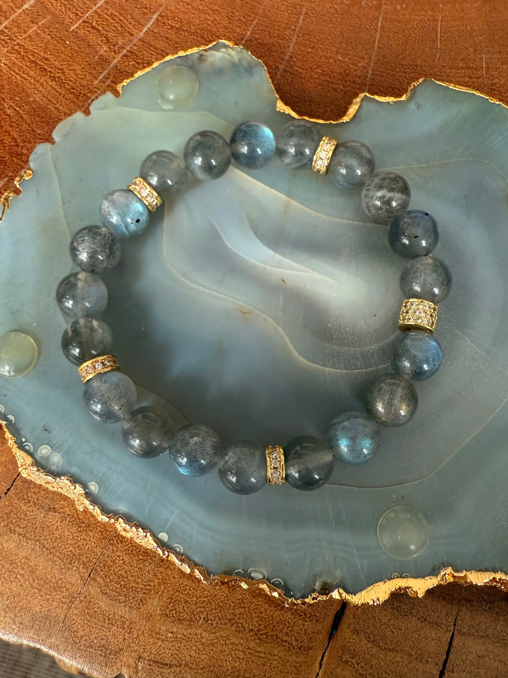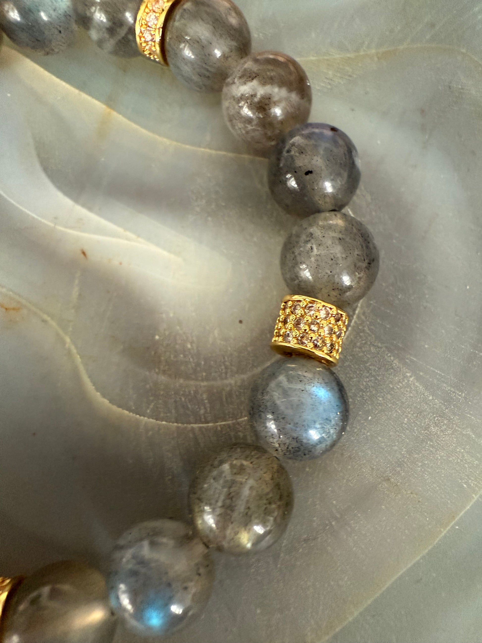 Labradorite and gold bead stretch bracelet.