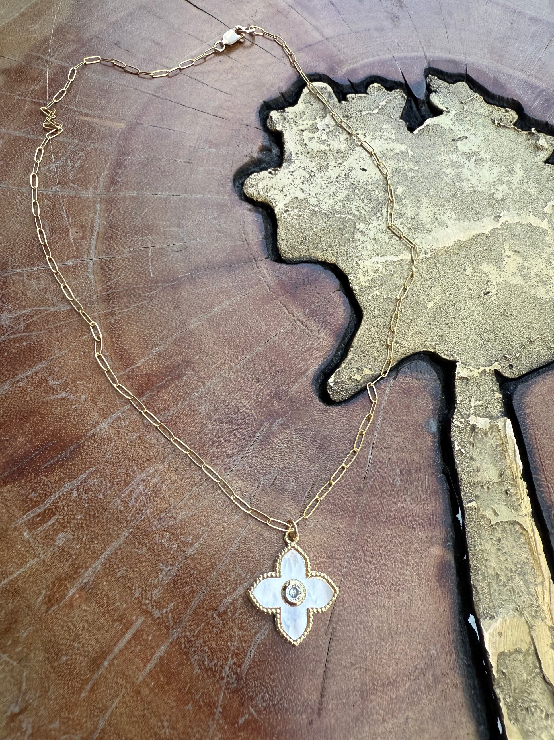 14K gold filled chain necklace with mother of pearl clover charm.
