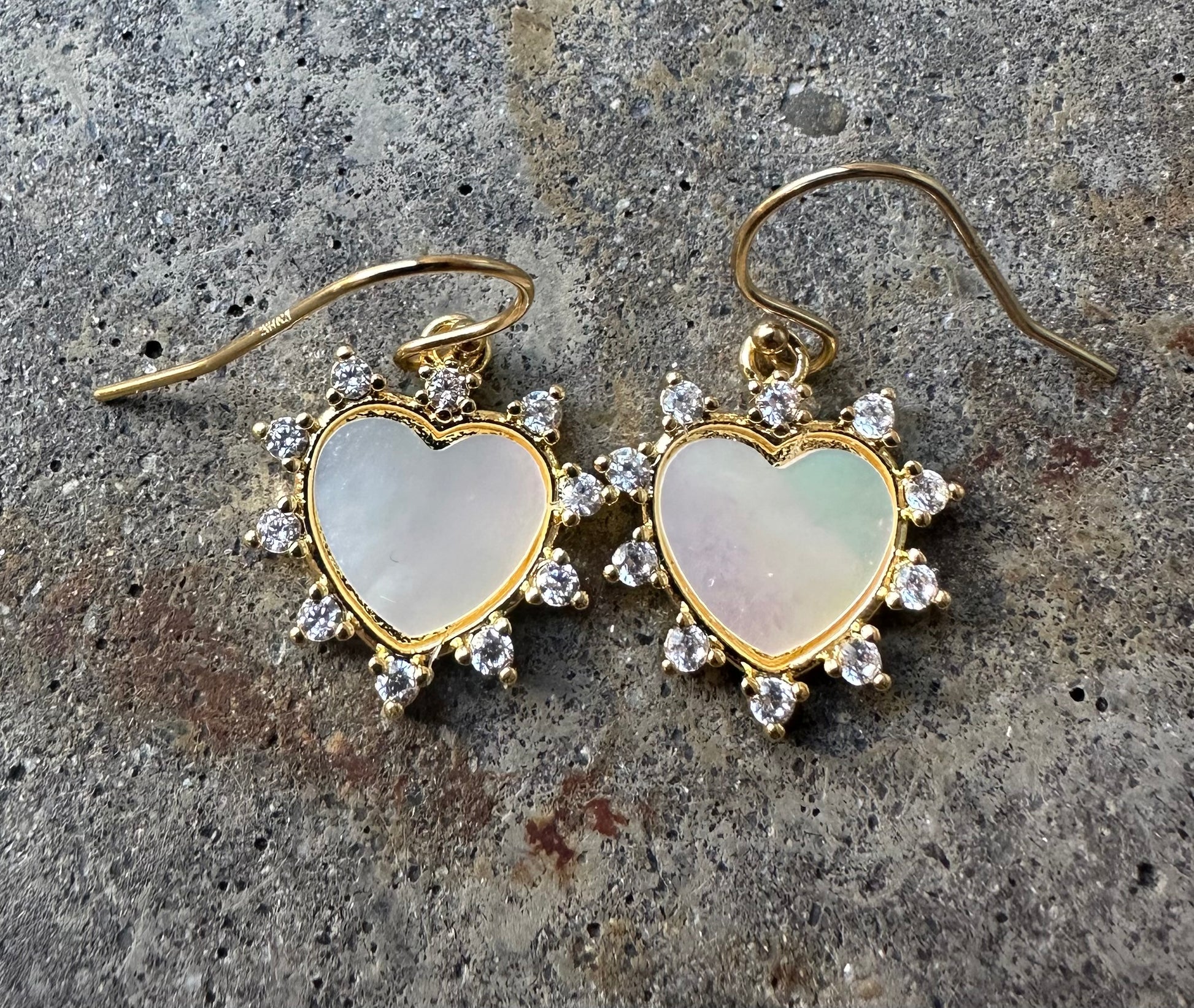Mother of Pearl hearts surrounded by CZ's on 14K gold filled ear wires.