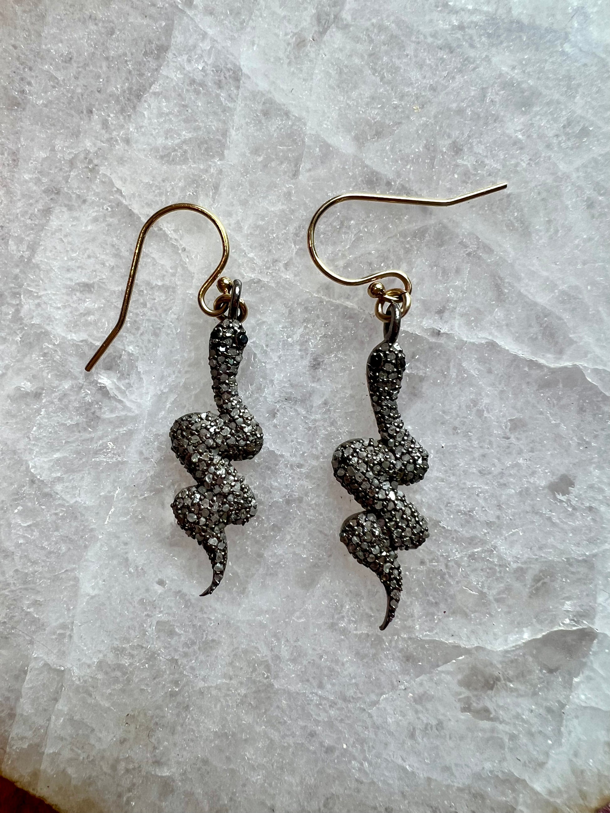 Oxidized sterling silver pave diamond snakey dangle earrings with black eyes.