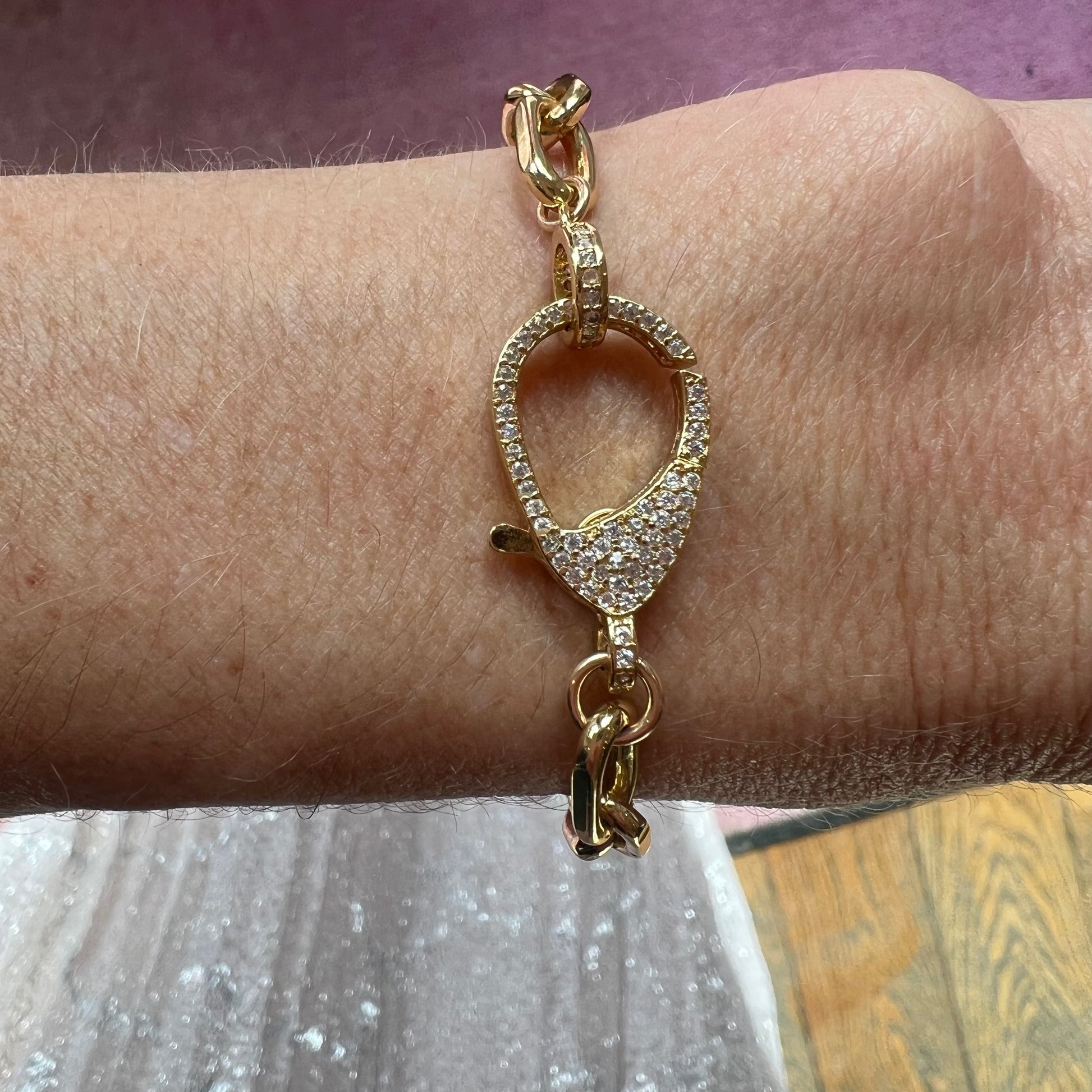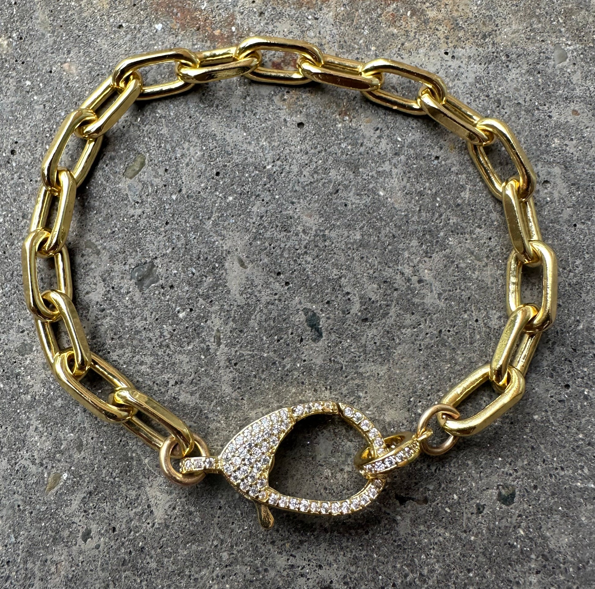 14k gold filled oval paperclip chain link bracelet with pave lobster claw clasp.