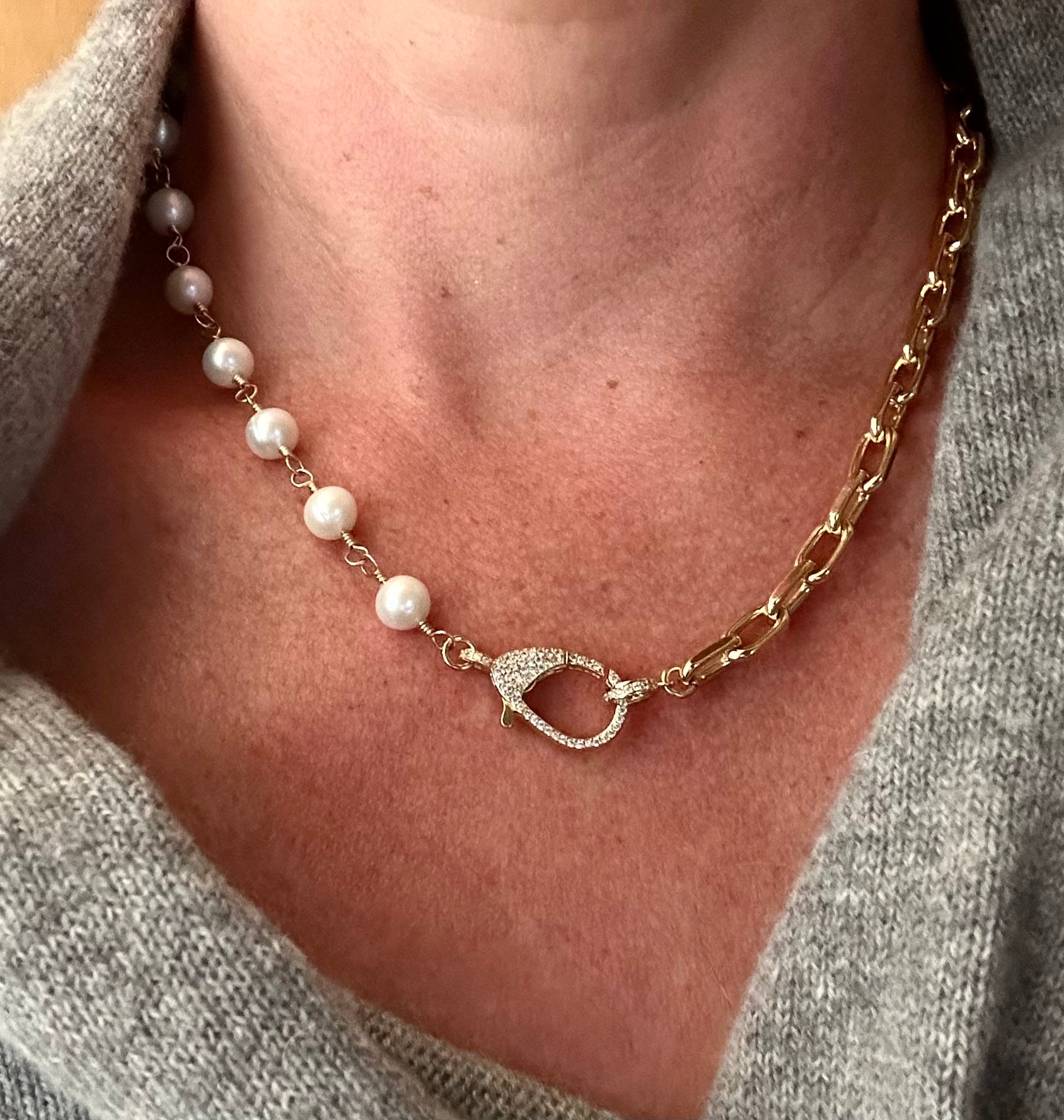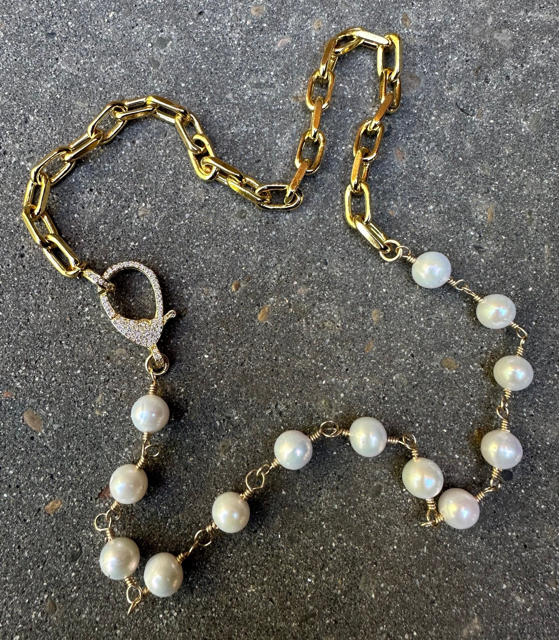 14K gold filled hand wire wrapped pearl and chain necklace w/pave clasp. 18 inches.